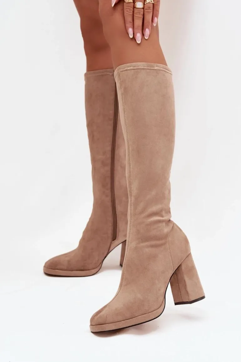 Kozaki damskie wykonane z miękkiego eko zamszu. Stabilny obcas w formie słupka zapewnia komfort noszenia, a delikatnie zaokrąglone noski dodają całości subtelnego charakteru. Model zapinany na zamek. Przylegająca cholewka ozdobiona przeszyciami pięknie podkreśla linię nóg, tworząc smukłą i kobiecą sylwetkę. Doskonałe zarówno do codziennych, jak i eleganckich stylizacji z sukienkami i spódnicami. Przy wyborze rozmiaru prosimy sugerować się tabelą rozmiarów.