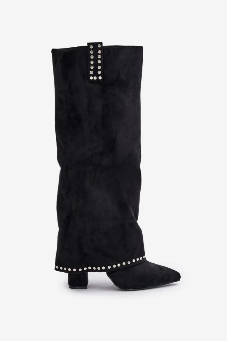 Damskie kozaki z luźną cholewką wykonane z eko zamszu. Osadzone na stabilnym słupkowym obcasie, z noskami w szpic, które dodają wyrafinowanego charakteru. Wnętrze ocieplone kocem obuwniczym zapewnia ciepło w chłodniejsze dni. Wywinięta cholewka, która płynnie przechodzi na obcas, stanowi wyjątkowy element tego modelu. Zapinane na suwak, świetnie komponują się z sukienkami i spódnicami, dodając szyku każdej stylizacji. Przy wyborze rozmiaru prosimy sugerować się tabelą rozmiarów.