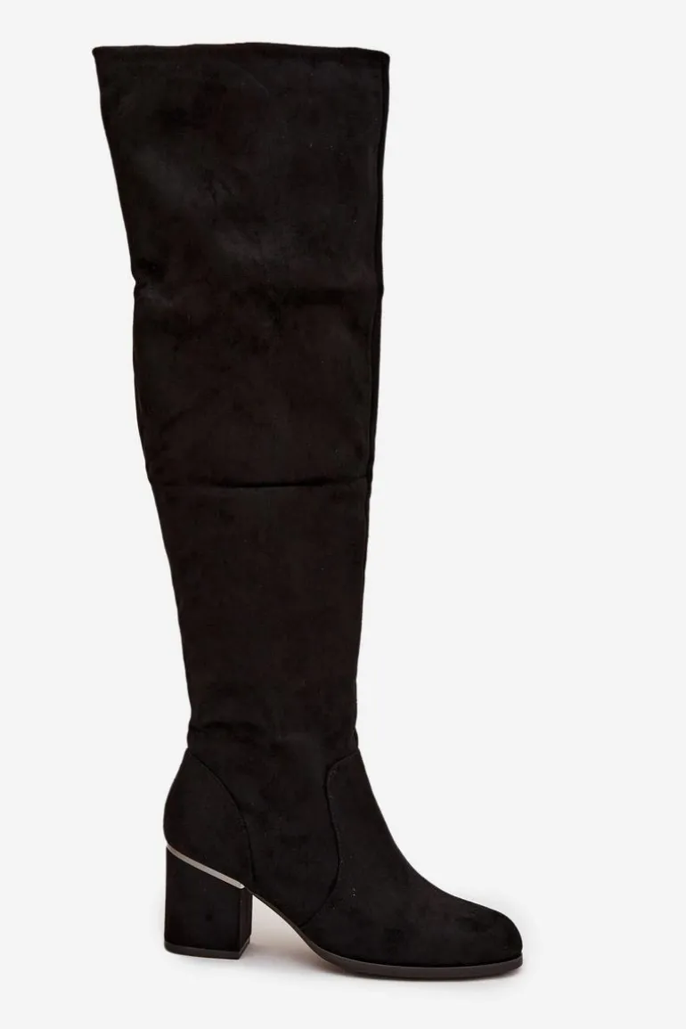 Kozaki damskie wykonane z imitacji zamszu to modna propozycja na chłodniejsze dni. Model z wysoką cholewką za kolano pięknie podkreśla nogi, dodając stylizacji kobiecego charakteru. Osadzone na stabilnym obcasie typu słupek zapewniają wygodę i pewność kroku. Kozaki są wsuwane, a zamek umieszczony na dole ułatwia zakładanie i dopasowanie do nogi. To doskonały wybór zarówno do sukienek i spódnic, jak i do dopasowanych spodni. Przy wyborze rozmiaru prosimy sugerować się tabelą rozmiarów.