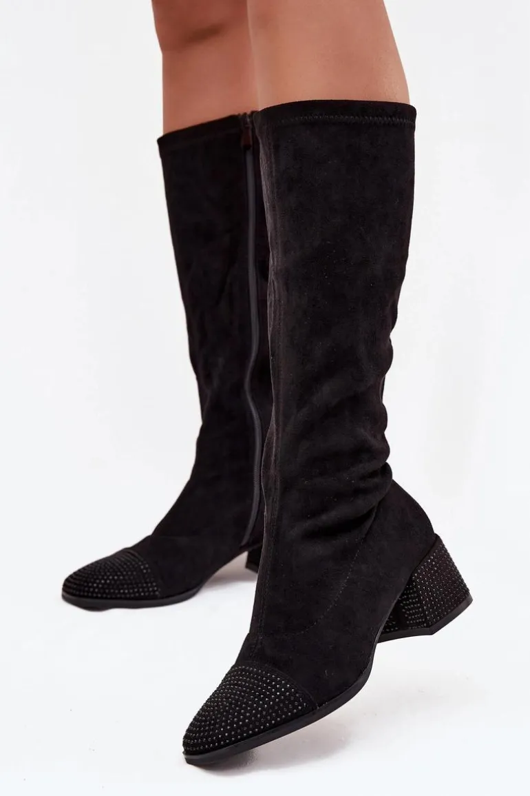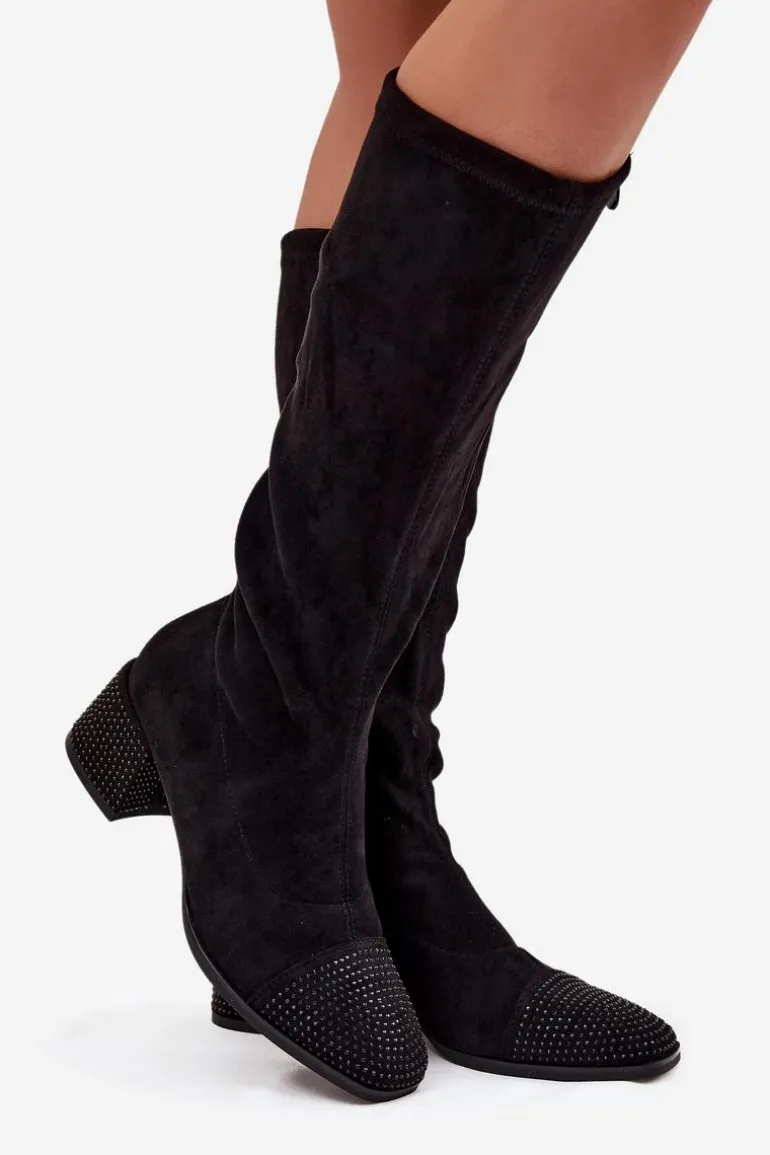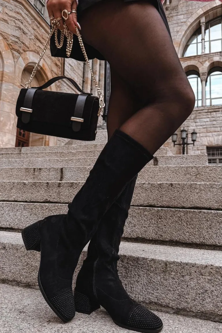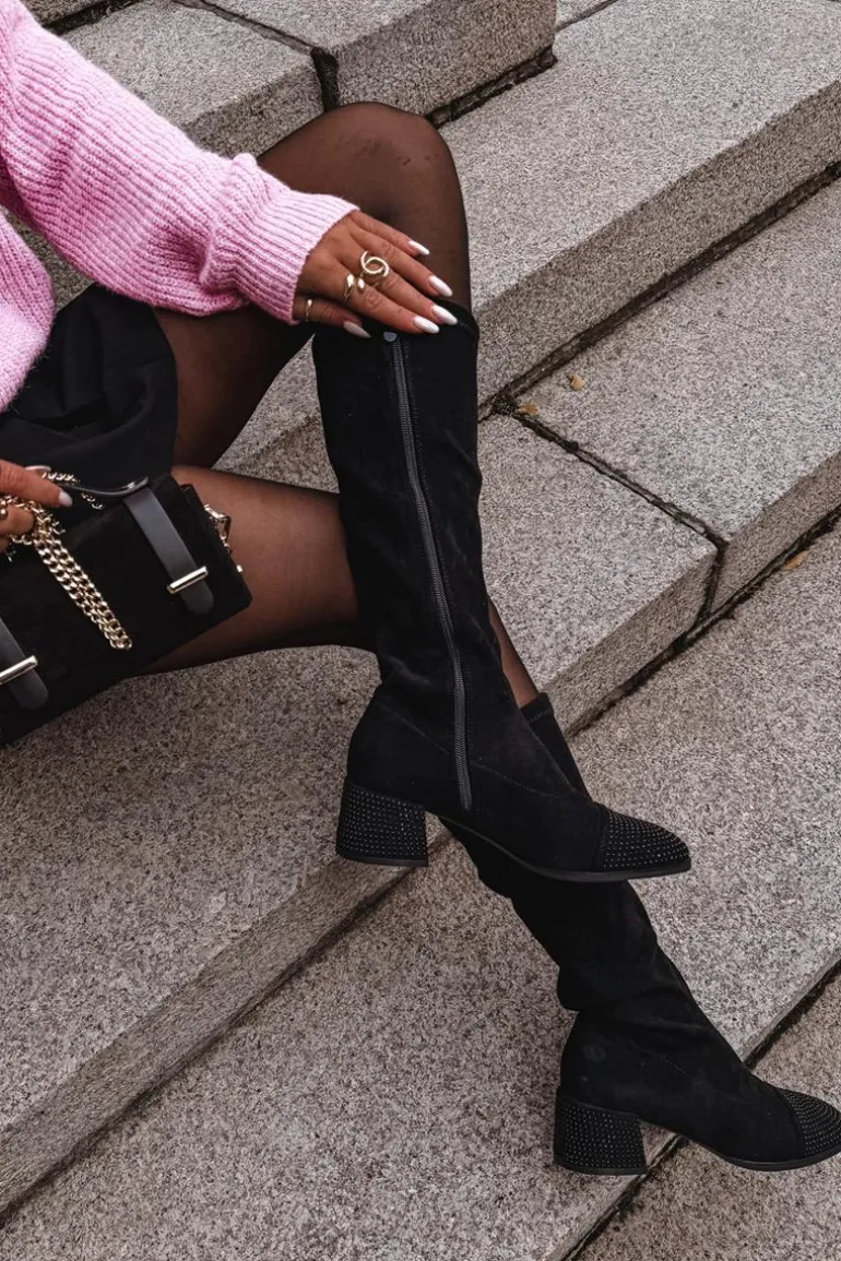 Kozaki damskie wykonane z eko zamszu to propozycja, która łączy klasykę z nutą nowoczesnego blasku. Model osadzony został na stabilnym obcasie w formie klocka, ozdobionym połyskującymi cyrkoniami, które dodają całości wyjątkowego, kobiecego charakteru. Delikatne zdobienia umieszczone również z przodu buta. Zapinane na zamek, są wygodne w użytkowaniu i doskonale dopasowują się do nogi. Wnętrze ocieplone jest wyłącznie na wysokości stopy miękkim kocem obuwniczym, co zapewnia komfort i ciepło w chłodniejsze dni, bez nadmiernego przegrzewania. Subtelne przeszycia na cholewce dodają elegancji i optycznie wysmuklają nogę. To stylowe kozaki doskonale sprawdzą się w bardziej wyjściowych stylizacjach, wnosząc odrobinę blasku do każdej jesienno-zimowej garderoby. Przy wyborze rozmiaru prosimy sugerować się tabelą rozmiarów.
