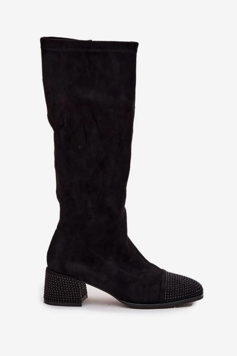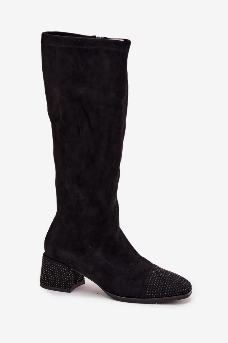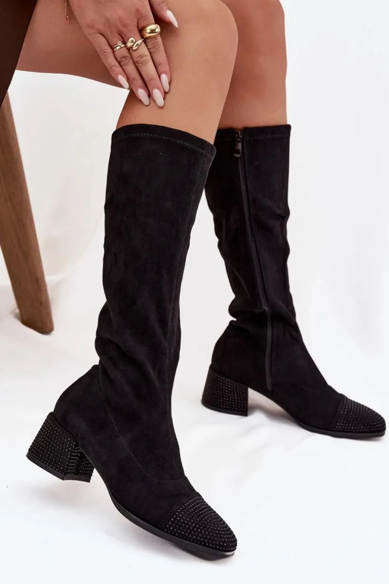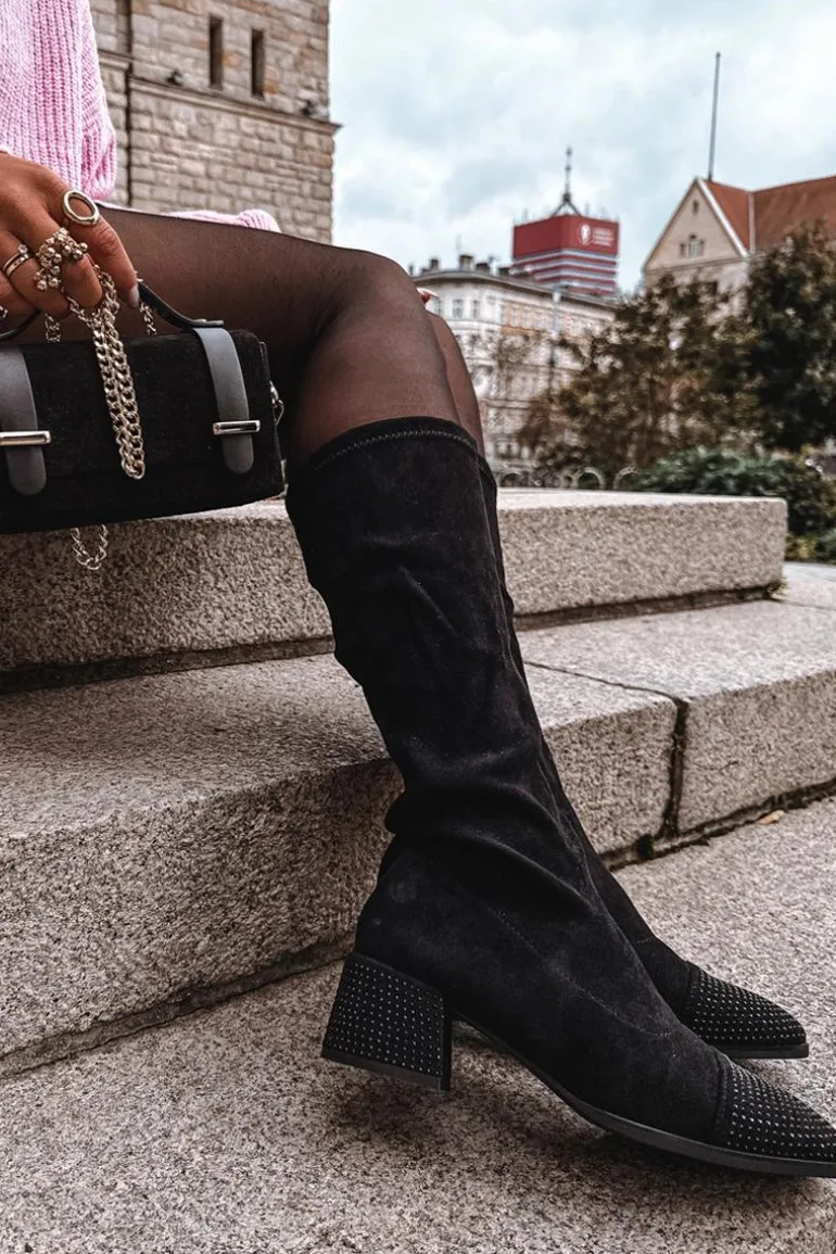 Kozaki damskie wykonane z eko zamszu to propozycja, która łączy klasykę z nutą nowoczesnego blasku. Model osadzony został na stabilnym obcasie w formie klocka, ozdobionym połyskującymi cyrkoniami, które dodają całości wyjątkowego, kobiecego charakteru. Delikatne zdobienia umieszczone również z przodu buta. Zapinane na zamek, są wygodne w użytkowaniu i doskonale dopasowują się do nogi. Wnętrze ocieplone jest wyłącznie na wysokości stopy miękkim kocem obuwniczym, co zapewnia komfort i ciepło w chłodniejsze dni, bez nadmiernego przegrzewania. Subtelne przeszycia na cholewce dodają elegancji i optycznie wysmuklają nogę. To stylowe kozaki doskonale sprawdzą się w bardziej wyjściowych stylizacjach, wnosząc odrobinę blasku do każdej jesienno-zimowej garderoby. Przy wyborze rozmiaru prosimy sugerować się tabelą rozmiarów.