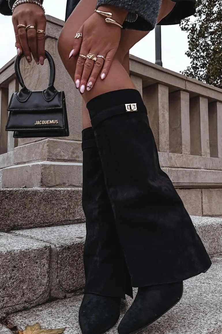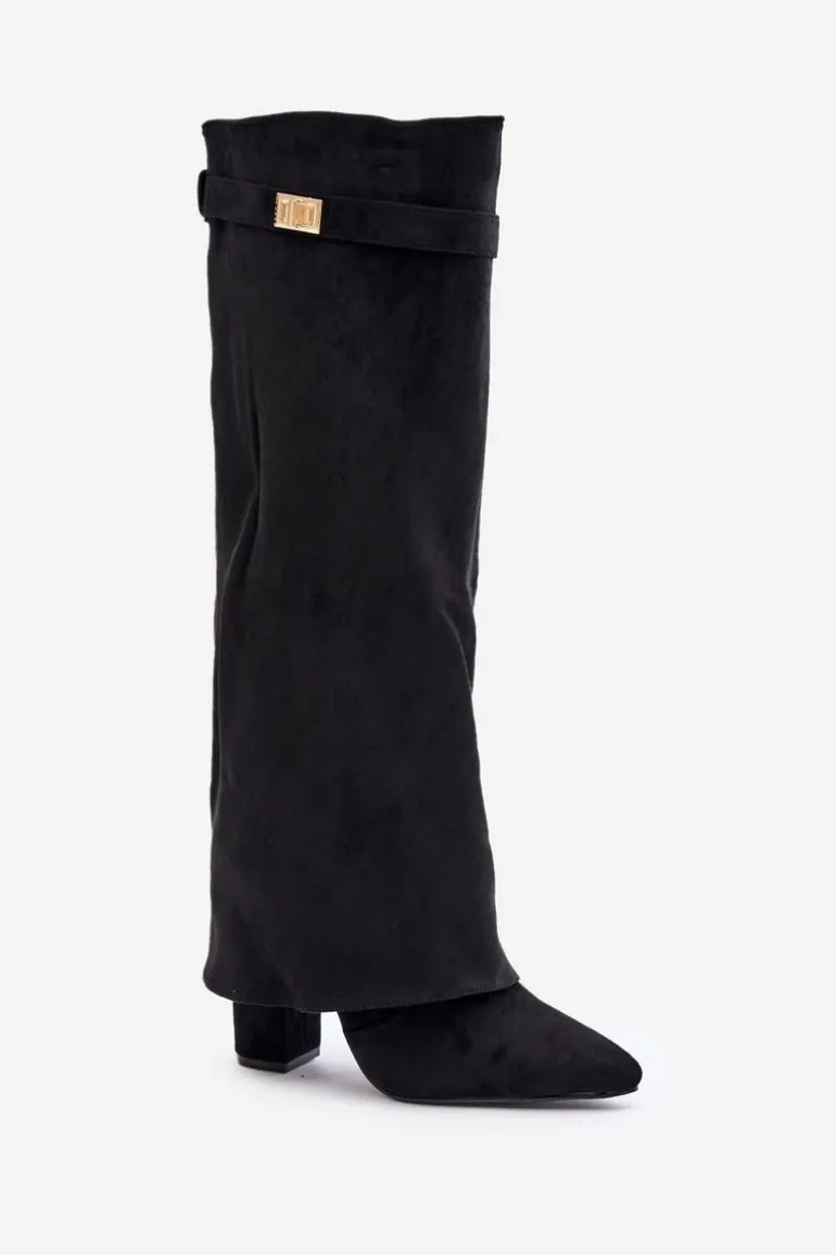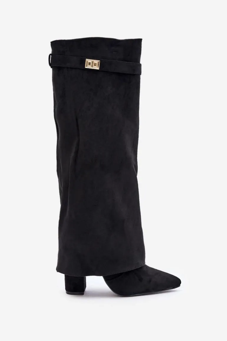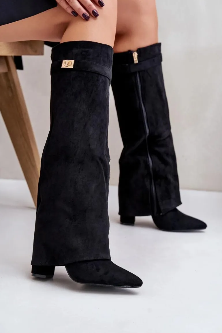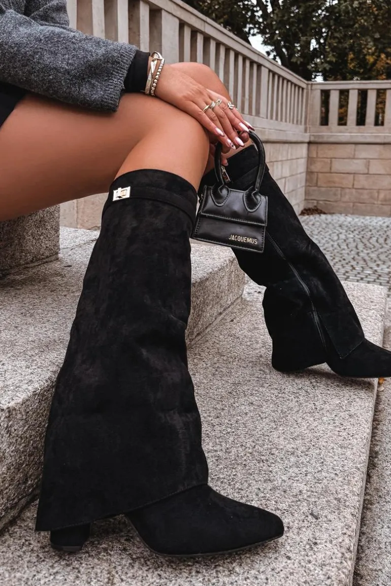 Eleganckie damskie kozaki z ekologicznego zamszu. Osadzone na obcasie w formie słupka. Noski w szpic. Wyjątkowym elementem tego modelu jest wywinięta cholewka z odpinanym paskiem na górze cholewki, która zachodzi na obcas. Zapięcie na suwak. Doskonałe do noszenia z sukienkami lub spódnicami! Przy wyborze rozmiaru prosimy sugerować się tabelą rozmiarów.