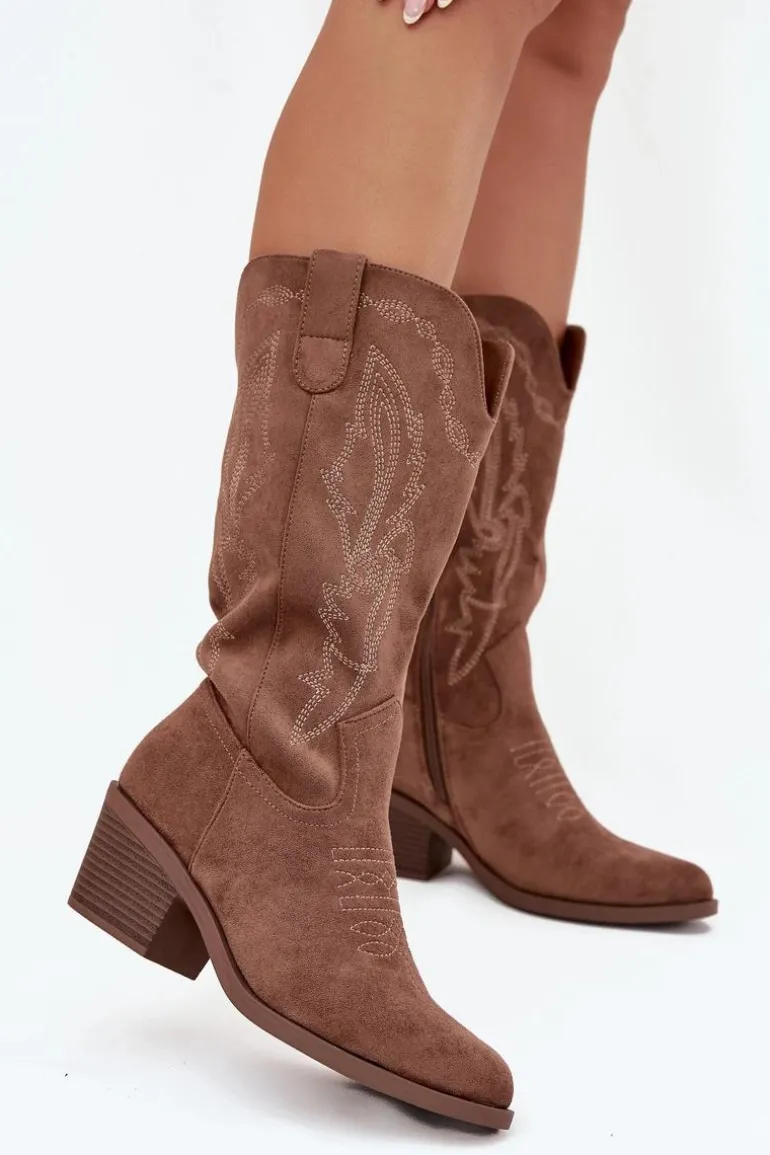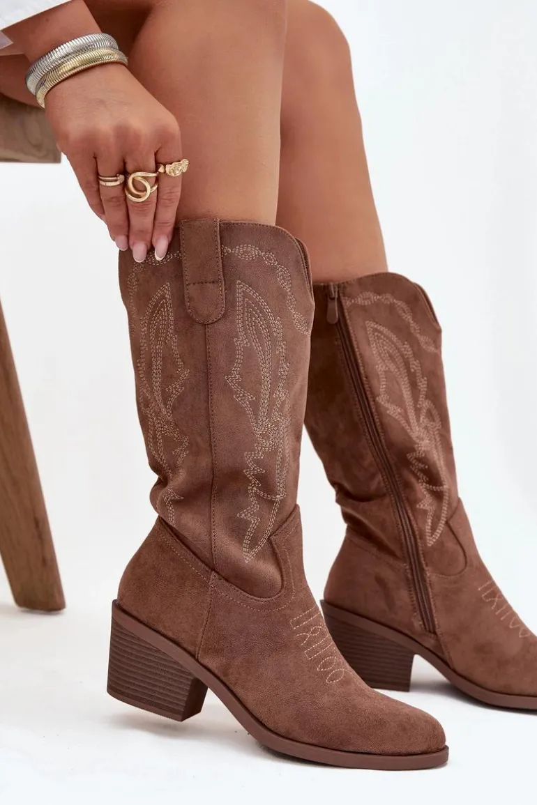 Kozaki kowbojki od marki Vinceza to połączenie klasycznego westernowego stylu z nowoczesnym, miejskim lookiem. Wykonane z eko zamszu, prezentują się lekko i stylowo, a charakterystyczne przeszycia podkreślają kowbojski charakter butów. Noski w kształcie migdała dodają im kobiecego akcentu, a stabilny obcas zapewnia wygodę i pewny krok. Model jest ocieplany, co gwarantuje komfort w chłodniejsze dni, a zamek po boku ułatwia szybkie zakładanie. Przy wyborze rozmiaru prosimy sugerować się tabelą rozmiarów.