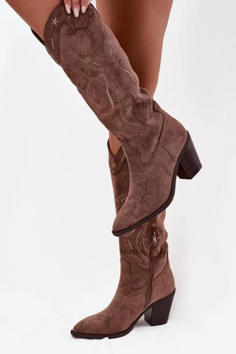 Kozaki damskie w stylu kowbojek, wykonane z eko zamszu to propozycja, która łączy klasykę z modnym, wyrazistym charakterem. Osadzone na stabilnym, ściętym obcasie typu słupek, dodają sylwetce smukłości, a jednocześnie gwarantują wygodę podczas chodzenia. Model wyróżnia się ozdobnymi przeszyciami oraz subtelnymi, złotymi elementami. Migdałowe noski podkreślają kobiecy styl, a praktyczny suwak umieszczony w dolnej części cholewki ułatwia zakładanie. To kozaki idealne do jesienno-zimowych stylizacji – doskonale komponują się zarówno z dopasowanymi spodniami, jak i sukienkami w stylu boho. Przy wyborze rozmiaru prosimy sugerować się tabelą rozmiarów.
