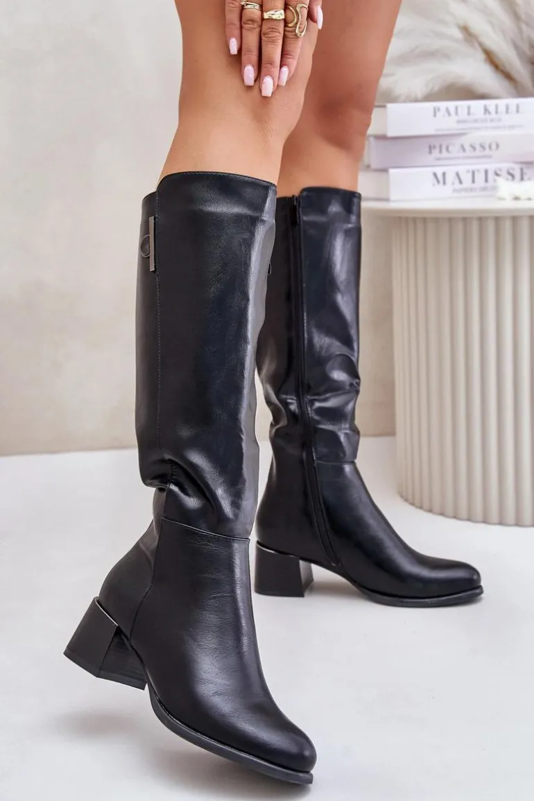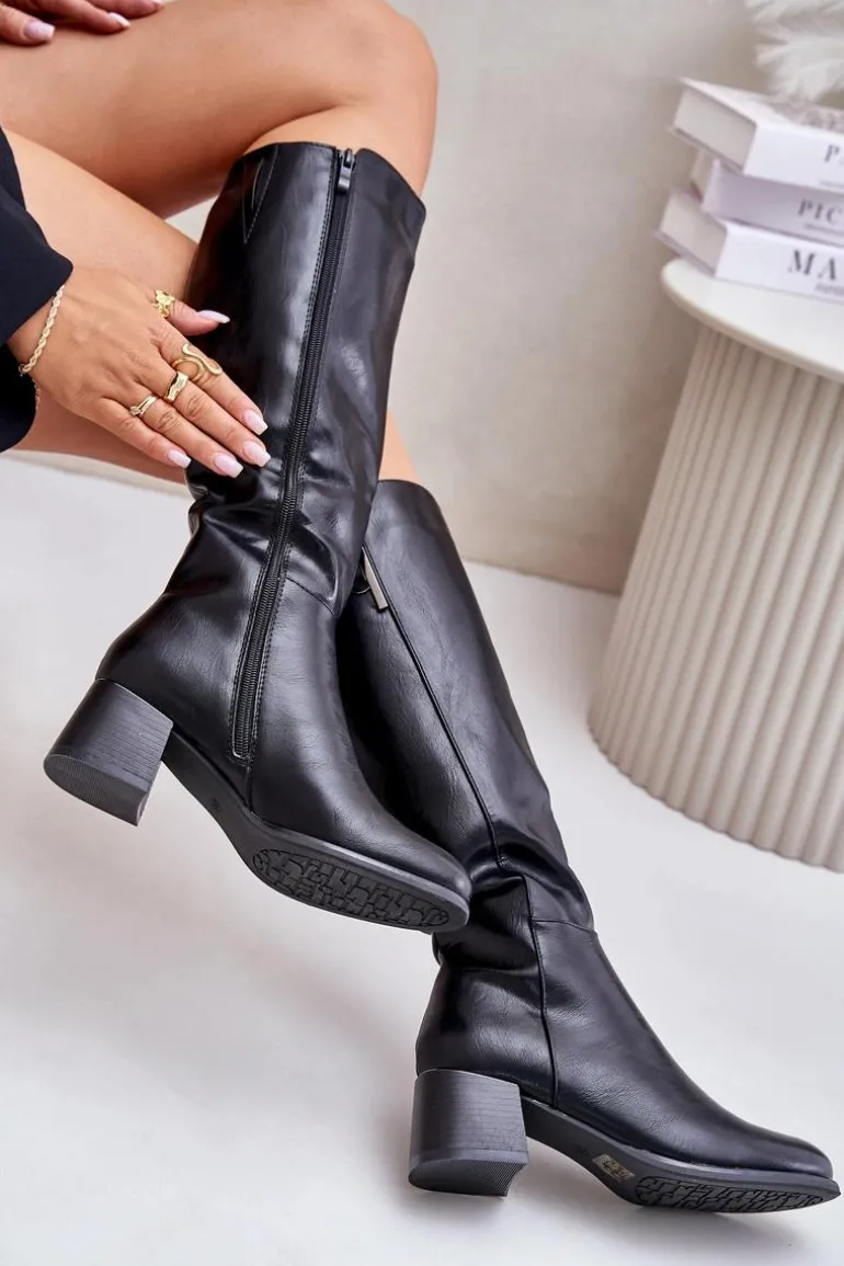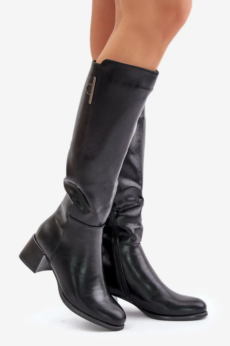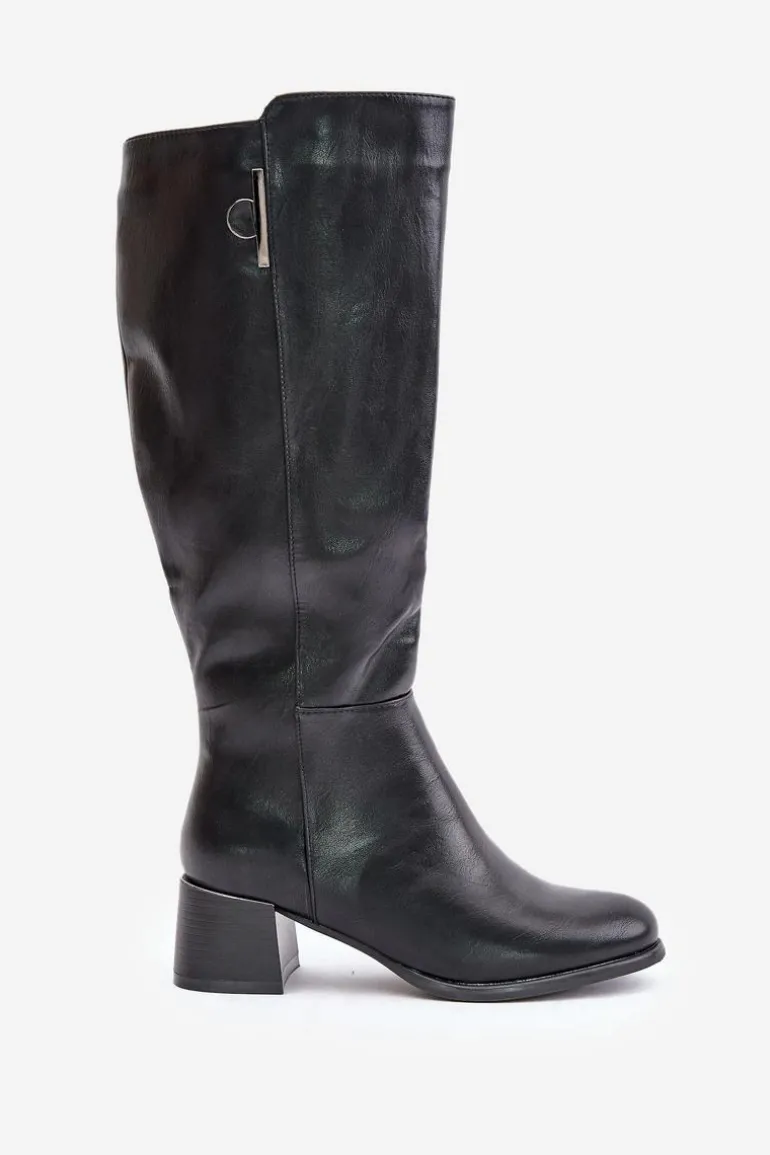 Botki marki Jezzi wykonane z eko skóry to elegancki wybór na chłodniejsze dni. Model osadzony na obcasie typu klocek, który zapewnia stabilność i komfort noszenia. Cholewka sięga przed kolano, dodając stylowego wyglądu i optycznie wydłużając nogi. Zapięcie na zamek ułatwia zakładanie, a ocieplenie kocem obuwniczym gwarantuje ciepło. Model ten idealnie sprawdzi się do stylizacji z sukienkami i spódnicami. Przy wyborze rozmiaru prosimy sugerować się tabelą rozmiarów.