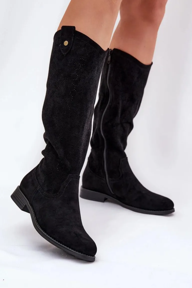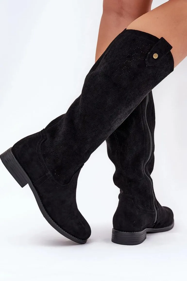 Kozaki damskie od marki S.Barski. Wykonane z eko zamszu. Osadzone na płaskim obcasie, zapewniają komfort przez cały dzień. Ażurowy wzór na cholewce dodaje im lekkości i nowoczesnego charakteru, a zapinane na zamek ułatwiają zakładanie. Te kozaki to doskonały wybór do codziennych, wiosennych stylizacji, łącząc funkcjonalność z modnym wyglądem.