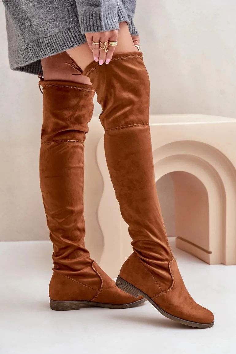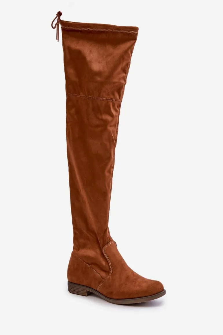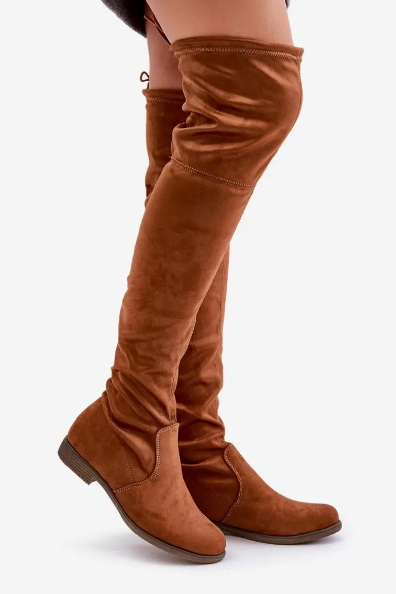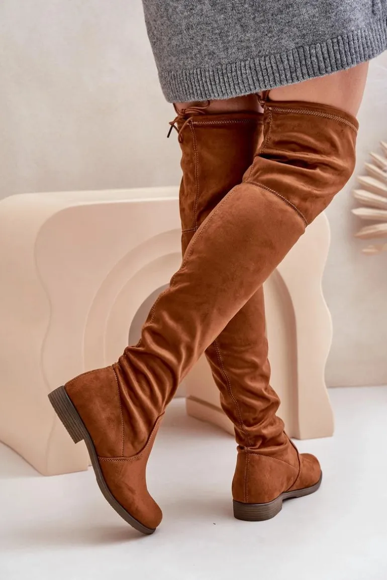 Damskie kozaki z cholewką sięgającą za kolano, wykonane z ekologicznego zamszu. Osadzone na płaskim, stabilnym obcasie z zaokrąglonymi noskami i usztywnionym zapiętkiem. Model wsuwany z regulowaną górą cholewki. Doskonale komponują się z sukienkami i spódnicami. Przy wyborze rozmiaru prosimy kierować tabelą rozmiarów.