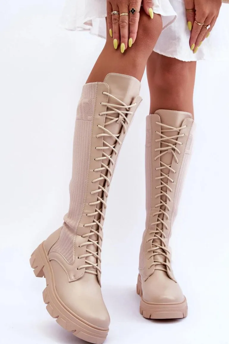 Modne damskie kozaki zostały wykonane z połączenia eko skóry oraz elastycznej tkaniny. Cholewka do kolana. Model osadzony na płaskim obcasie i platformie. Buty te posiadają usztywniany zapiętek. Model wsuwany z dodatkowym wiązaniem. Te klasyczne kozaki świetnie będą pasować do jesiennych stylizacji. Modny fason, który powinnaś mieć! Przy wyborze rozmiaru prosimy kierować tabelą rozmiarów.