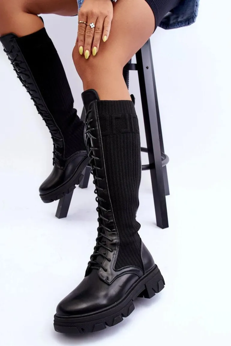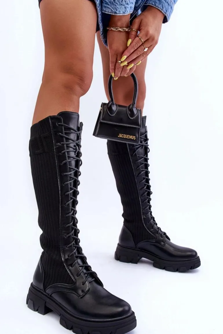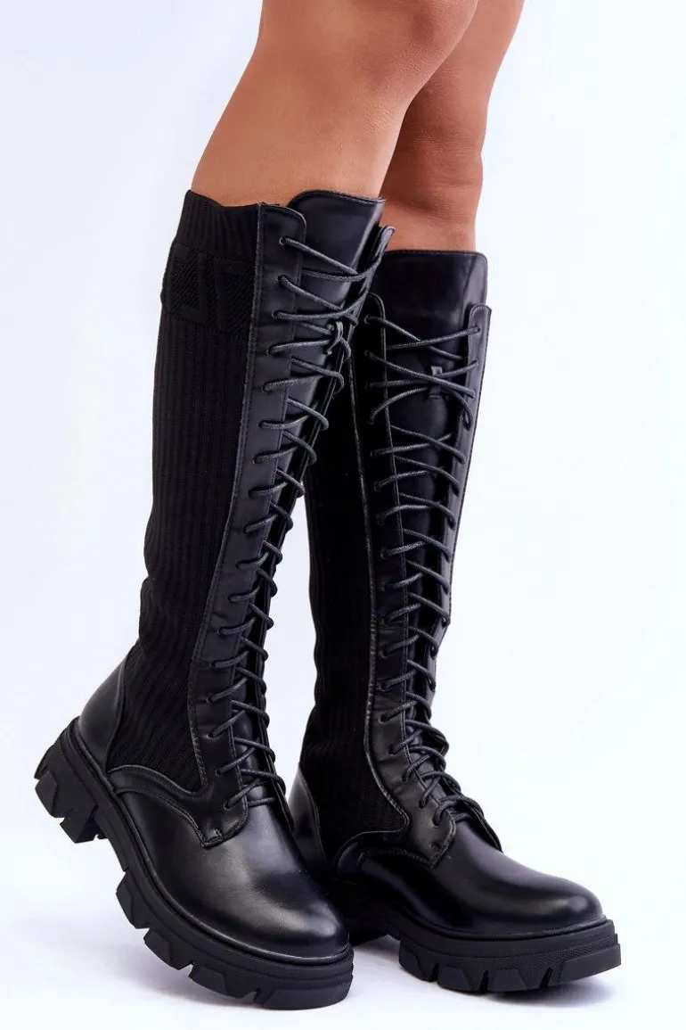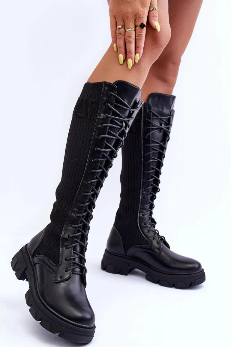 Modne damskie kozaki zostały wykonane z połączenia eko skóry oraz elastycznej tkaniny. Cholewka do kolana. Model osadzony na płaskim obcasie i platformie. Buty te posiadają usztywniany zapiętek. Model wsuwany z dodatkowym wiązaniem. Te klasyczne kozaki świetnie będą pasować do jesiennych stylizacji. Modny fason, który powinnaś mieć! Przy wyborze rozmiaru prosimy kierować tabelą rozmiarów.