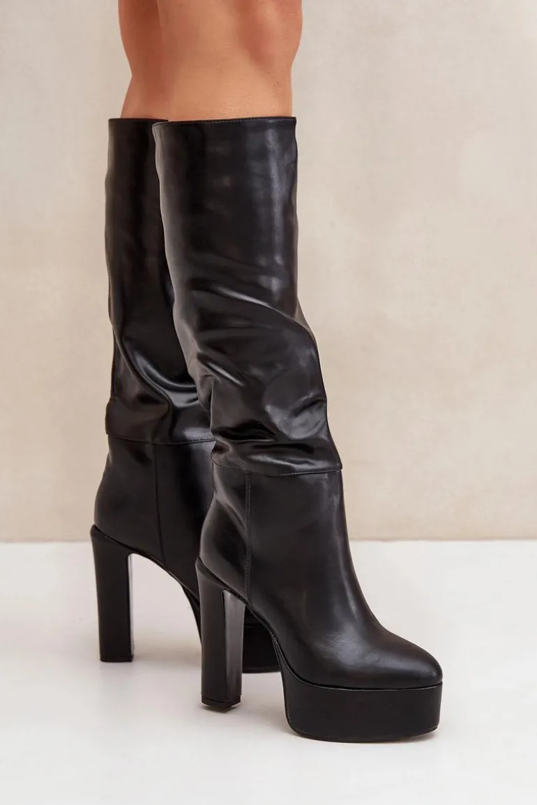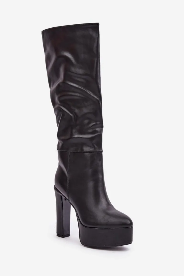 Wsuwane kozaki damskie wykonane z eko skóry. Osadzone na masywnej platformie i stabilnym obcasie typu słupek, łączą styl z komfortem. Wnętrze ocieplane kocem obuwniczym zapewnia ciepło w chłodne dni. Cholewka z delikatnym marszczeniem dodaje elegancji i subtelnego charakteru. Idealne do codziennych i bardziej stylowych zimowych stylizacji. Przy wyborze rozmiaru prosimy sugerować się tabelą rozmiarów.