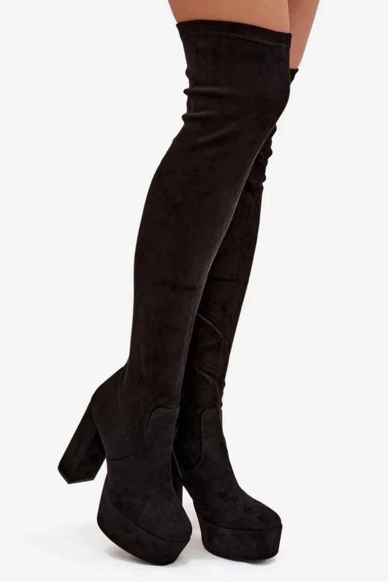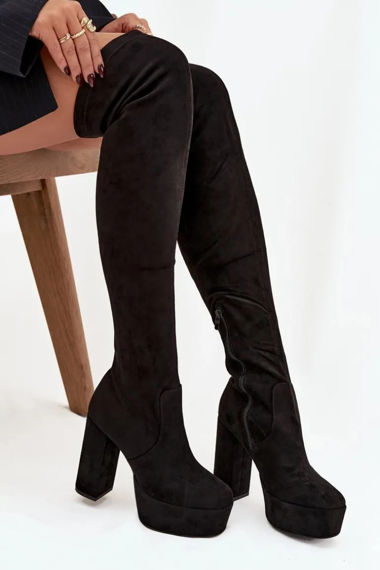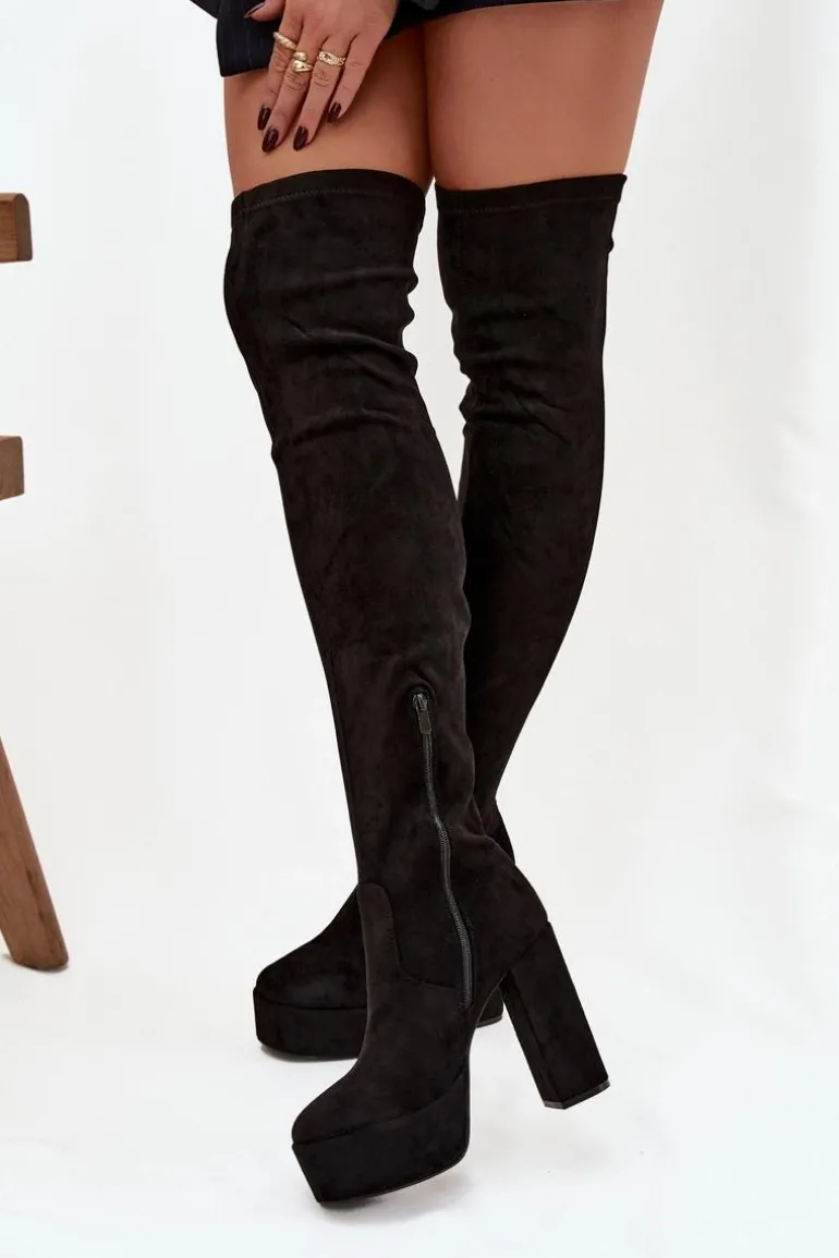 Kozaki damskie za kolano wykonane z miękkiego eko zamszu to idealna propozycja dla kobiet, które cenią modny wygląd. Model został osadzony na stabilnym obcasie typu słupek oraz platformie, co zapewnia komfort noszenia i jednocześnie pięknie wysmukla sylwetkę. Buty są wsuwane, a zamek umieszczony z boku ułatwia ich zakładanie i zdejmowanie. Długa cholewka optycznie wydłuża nogi, dodając stylizacji elegancji i kobiecego charakteru. To doskonały wybór zarówno do codziennych, jak i wieczorowych zestawów – świetnie prezentują się w połączeniu z sukienkami, spódnicami czy dopasowanymi spodniami. Przy wyborze rozmiaru prosimy sugerować się tabelą rozmiarów.