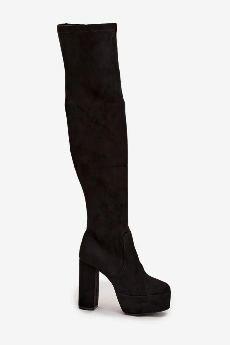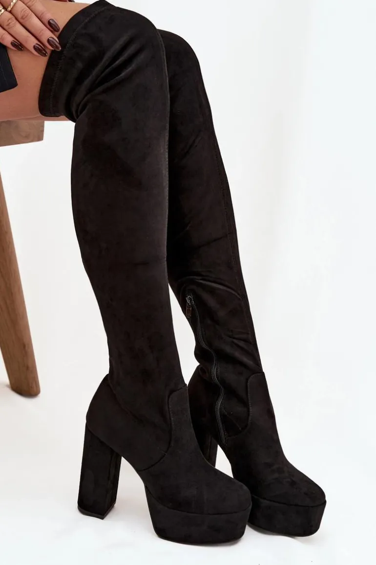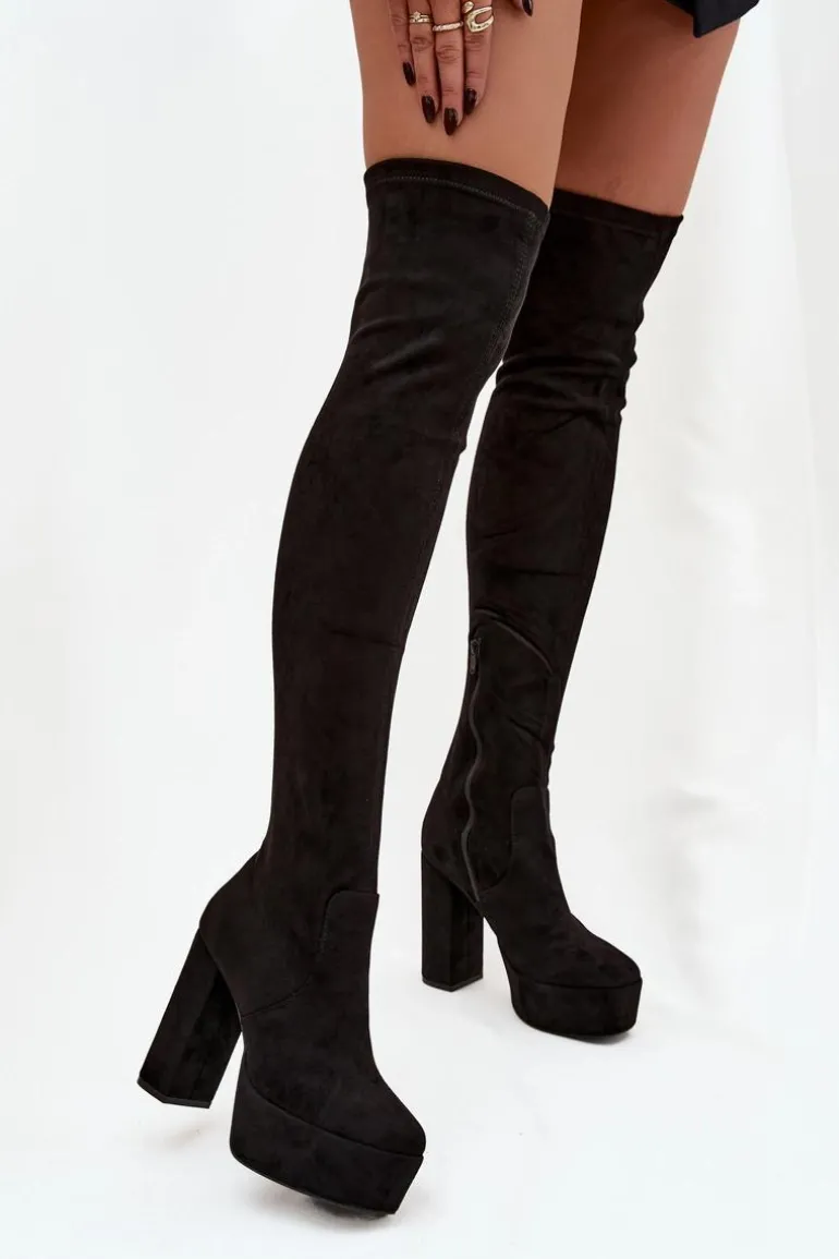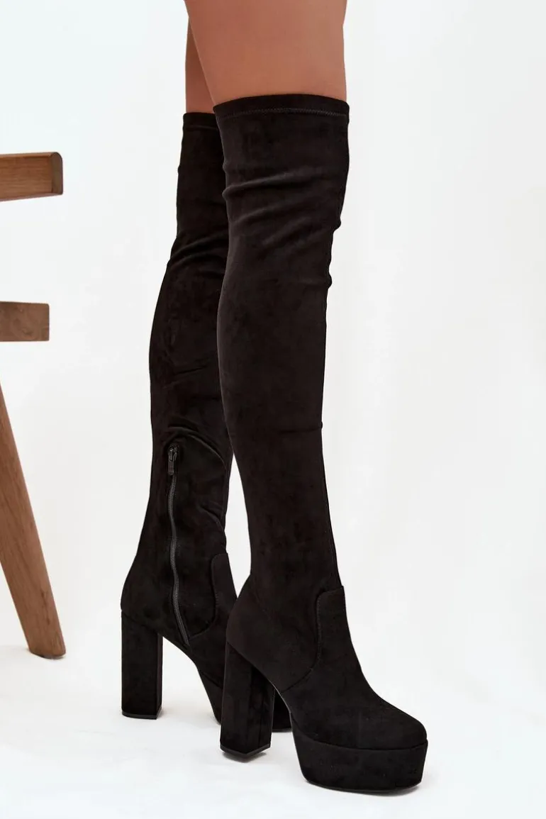 Kozaki damskie za kolano wykonane z miękkiego eko zamszu to idealna propozycja dla kobiet, które cenią modny wygląd. Model został osadzony na stabilnym obcasie typu słupek oraz platformie, co zapewnia komfort noszenia i jednocześnie pięknie wysmukla sylwetkę. Buty są wsuwane, a zamek umieszczony z boku ułatwia ich zakładanie i zdejmowanie. Długa cholewka optycznie wydłuża nogi, dodając stylizacji elegancji i kobiecego charakteru. To doskonały wybór zarówno do codziennych, jak i wieczorowych zestawów – świetnie prezentują się w połączeniu z sukienkami, spódnicami czy dopasowanymi spodniami. Przy wyborze rozmiaru prosimy sugerować się tabelą rozmiarów.
