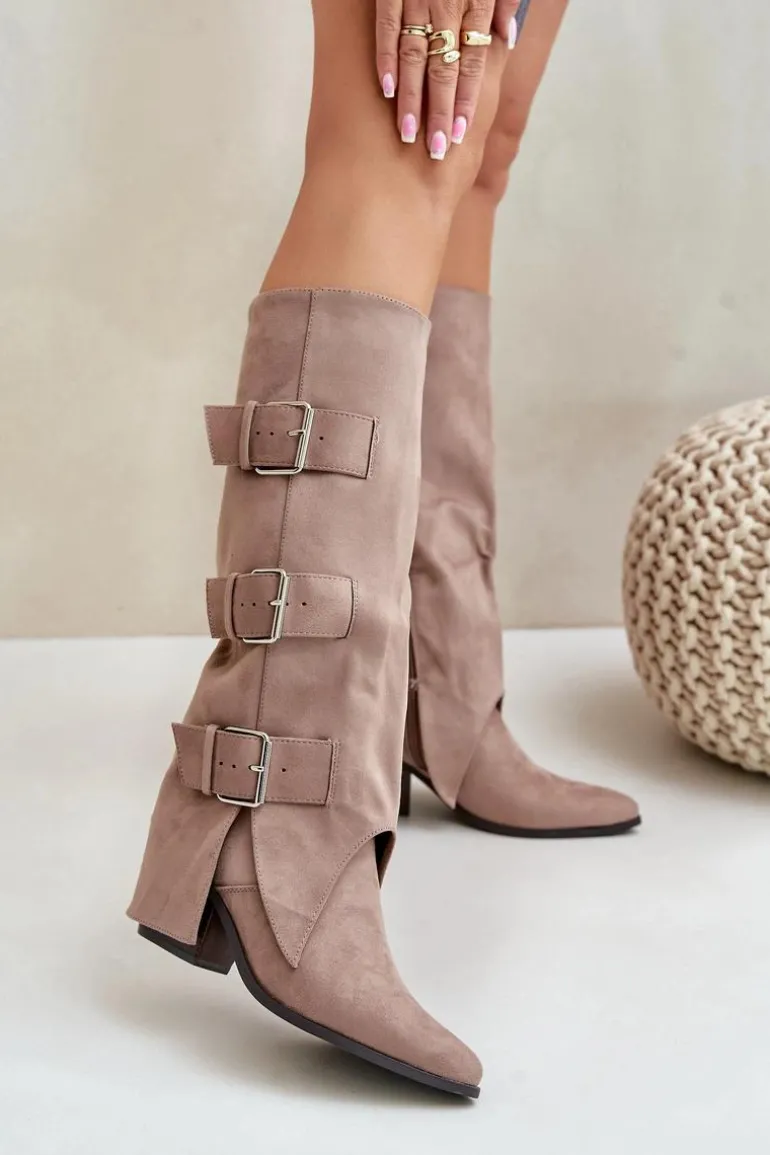 Stylowe kozaki damskie wykonane z eko zamszu. Osadzone na obcasie w formie słupka. Noski w szpic. Środek ocieplony kocem obuwniczym. Głównym atutem tego modelu jest wywinięta cholewka ozdobiona złotymi klamrami. Model wsuwany z dodatkowym suwakiem na dole. Idealnie sprawdzą się w stylizacjach z luźnymi marynarkami, spódnicami i sukienkami! Koniecznie powinnaś je mieć! Przy wyborze rozmiaru prosimy sugerować się tabelą rozmiarów.