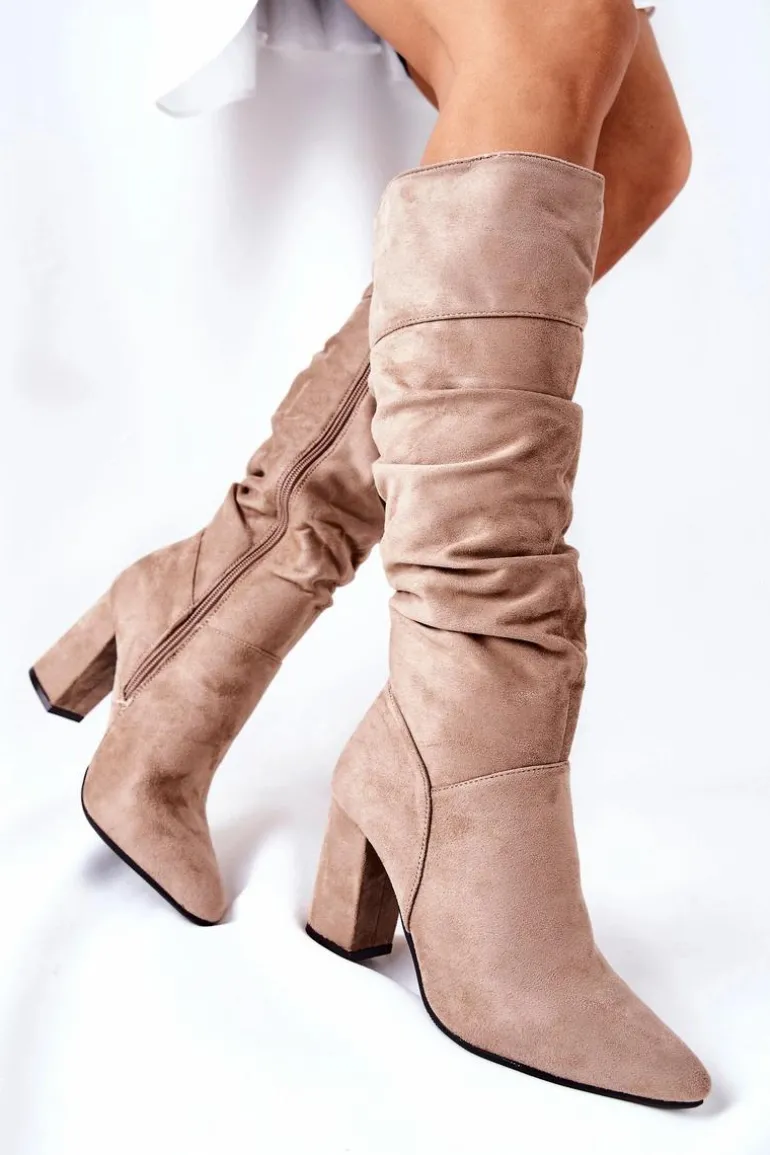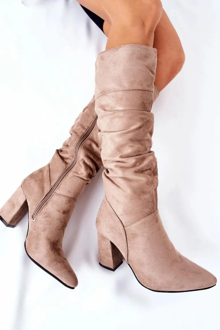 Piękne kozaki na słupku wykonane z zamszowej skóry ekologicznej. Buty osadzone na niewysokim słupku. Zapinanie z boku cholewki ułatwi zakładanie. Cholewka lekko marszczona, co sprawia, że buty wyglądają zjawiskowo. Idealnie będą pasować do wielu stylizacji!Przy wyborze rozmiaru prosimy sugerować się tabelą rozmiarów.