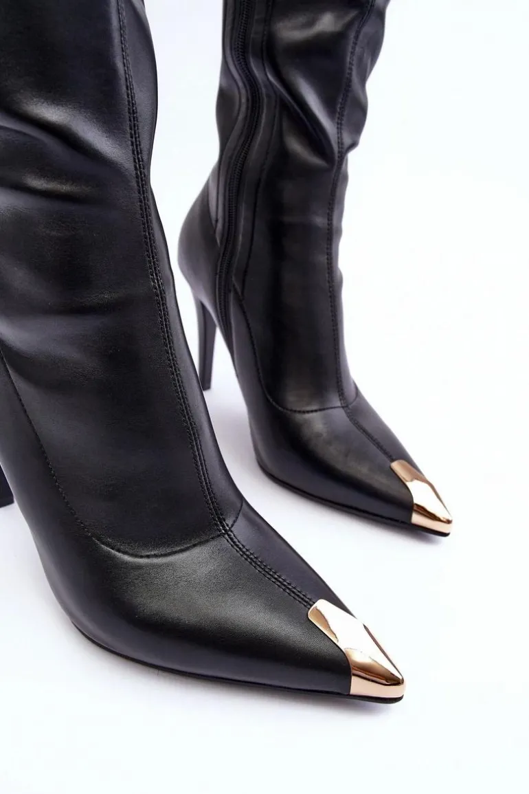Eleganckie kozaki damskie marki S.Barski. Wykonane z eko skóry. Osadzone na obcasie w postaci szpilki. Noski w szpic posiadają złoty element z tworzywa sztucznego. Cholewka przed kolano zapinana na suwak. Ocieplenie wewnątrz na wysokości stopy. Przy wyborze rozmiaru prosimy sugerować się tabelą rozmiarów.