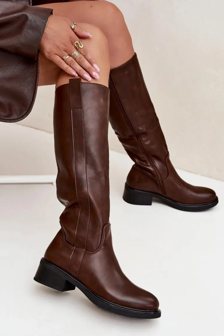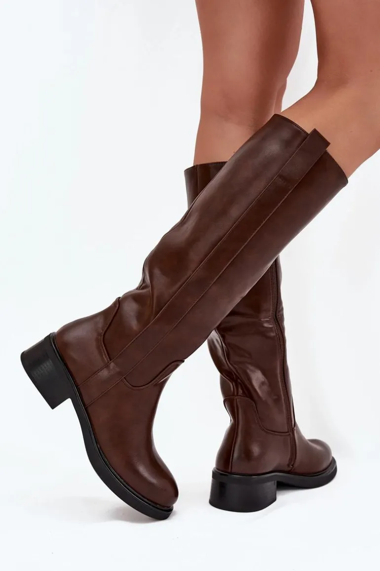 Kozaki oficerki damskie z eko skóry, osadzone na niskim obcasie w formie klocka, to połączenie klasyki z komfortem. Cholewka sięga przed kolano. Zapinane na zamek, co ułatwia ich zakładanie. Ocieplane kocem obuwniczym. Idealne do codziennych stylizacji, doskonale komponują się z sukienkami, spódnicami i spodniami. Przy wyborze rozmiaru prosimy sugerować się tabelą rozmiarów.