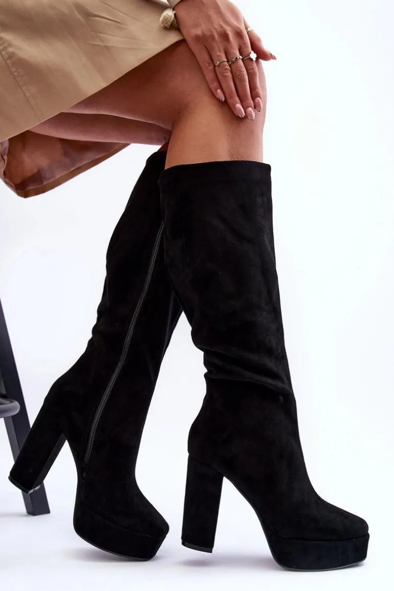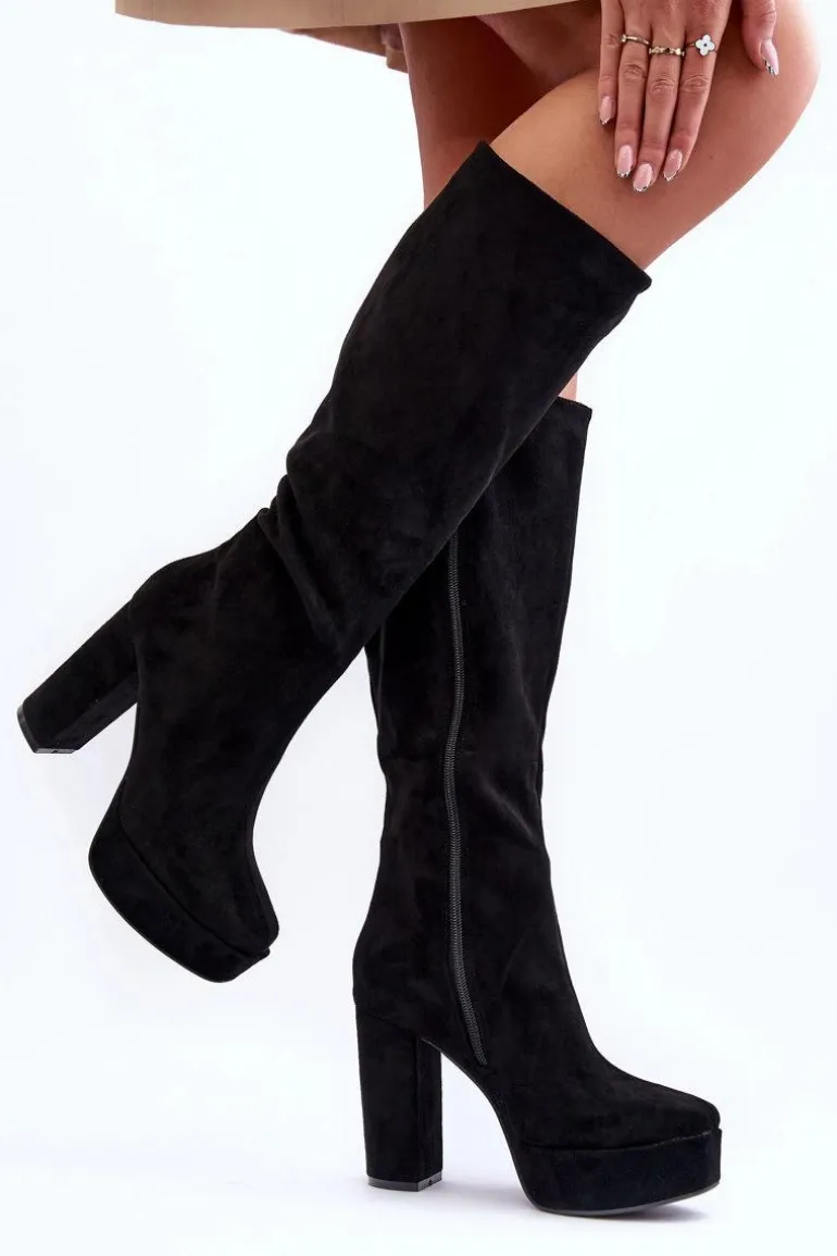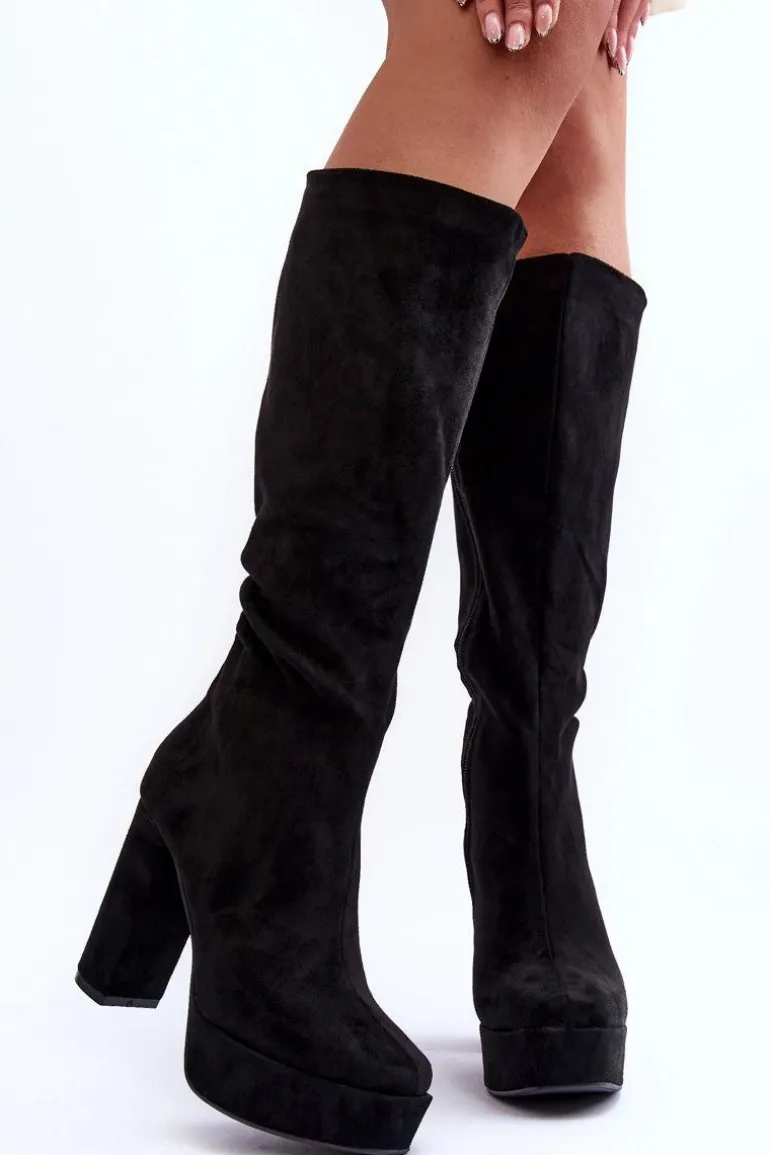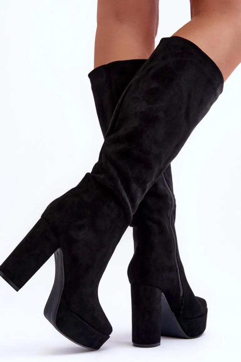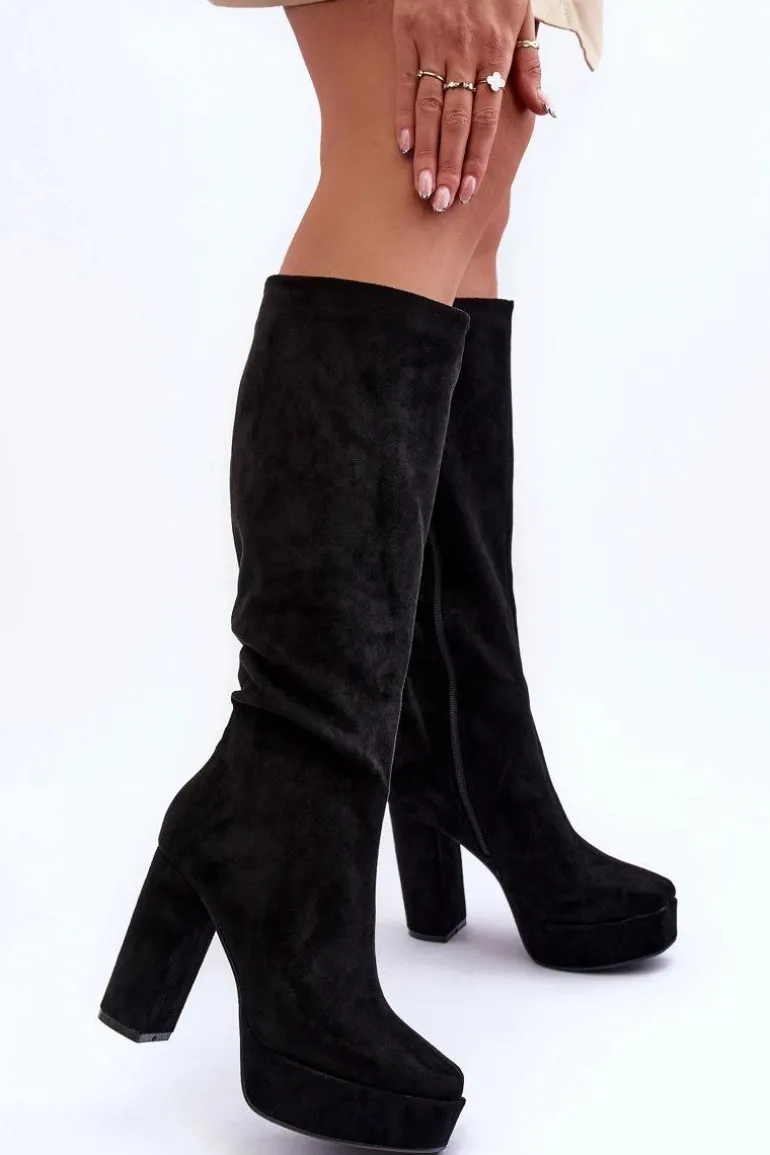 Modne kozaki damskie zostały wykonane z eko zamszu. Osadzone na grubej platformie oraz obcasie w postaci masywnego słupka. Model zapinany na suwak. Cholewka przed kolano, noski kwadratowe. Świetny fason, który wyróżni Cię z tłumu. Nie posiadają ocieplenia. Koniecznie powinnaś je mieć! Przy wyborze rozmiaru prosimy sugerować się tabelą rozmiarów.