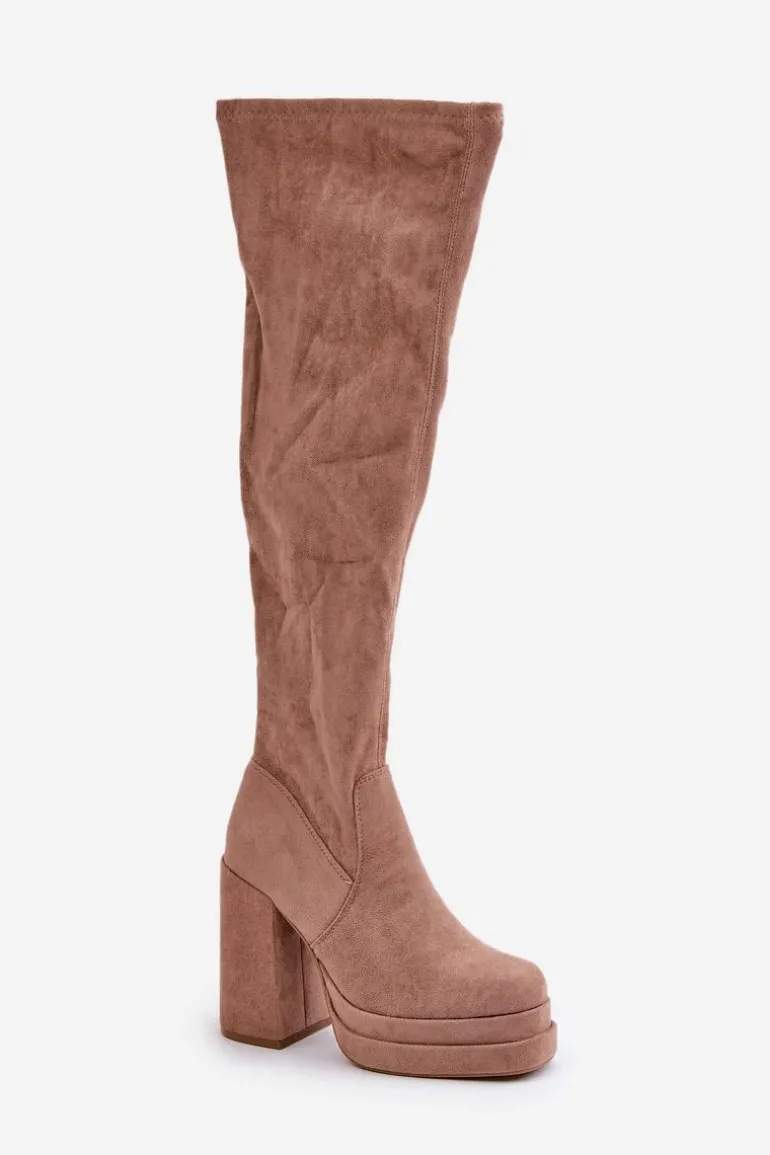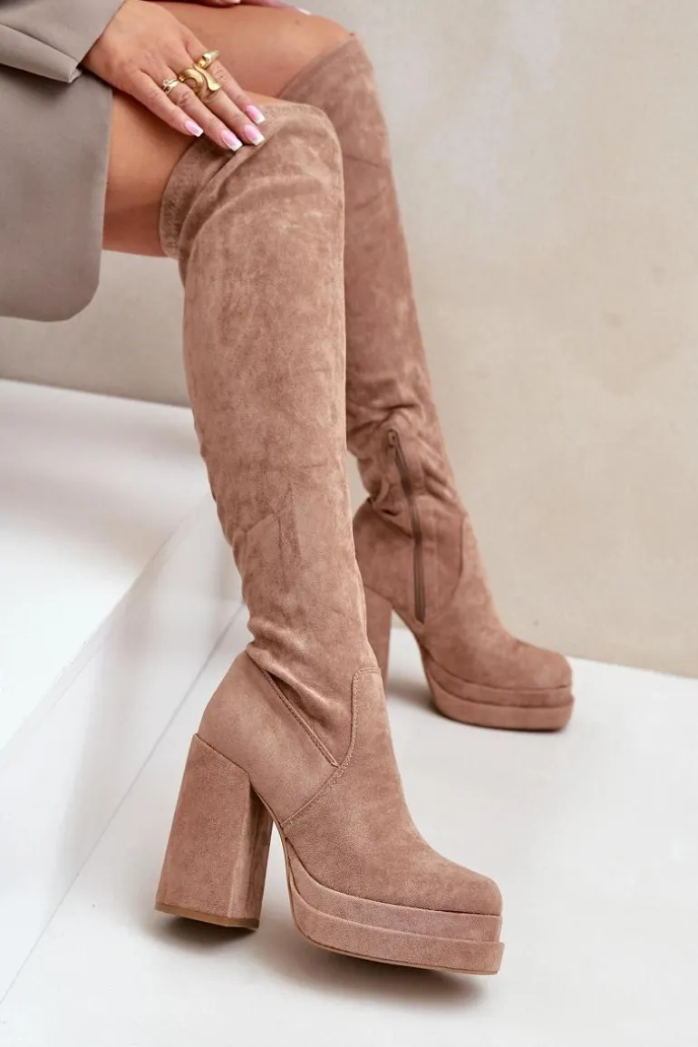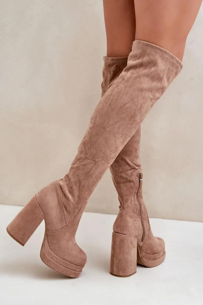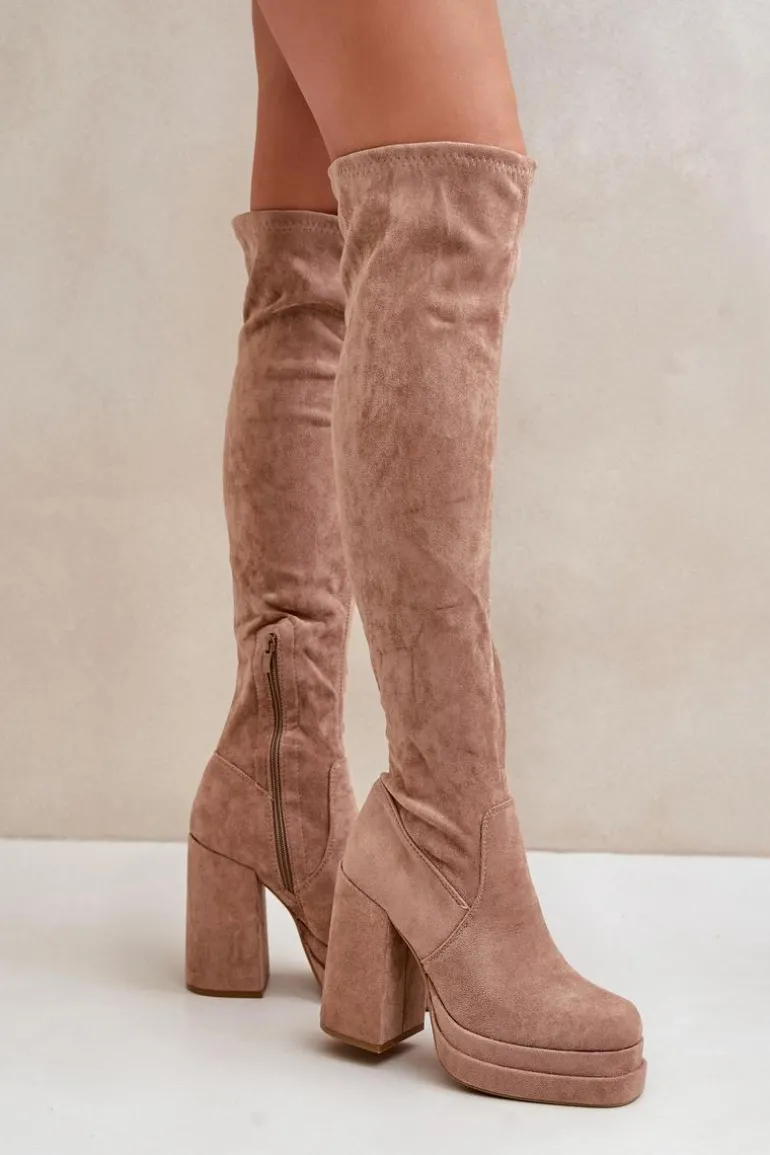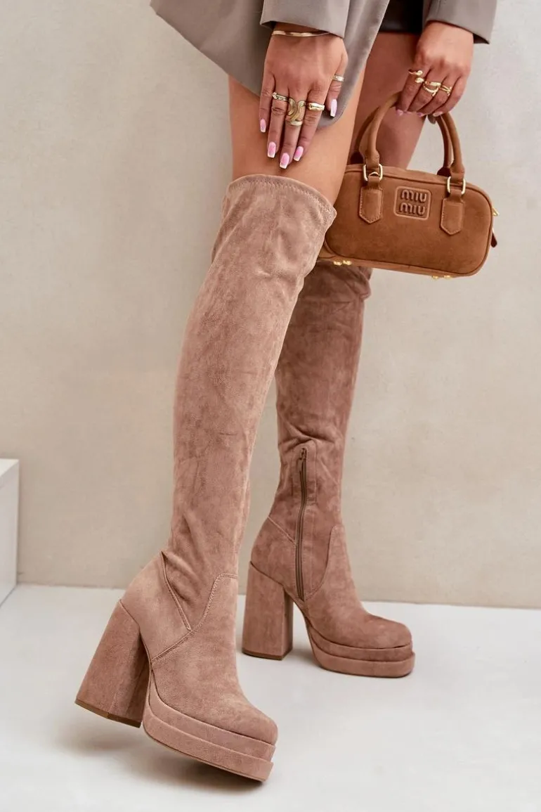 Kozaki z eko zamszu to świetna propozycja dla miłośniczek modnych, a zarazem wygodnych butów na chłodniejsze dni. Model wyróżnia się wysoką cholewką sięgającą za kolano, która dodaje elegancji i wydłuża sylwetkę. Kozaki są wsuwane, ale dla większej wygody posiadają dodatkowy suwak na dole cholewki, ułatwiający zakładanie. Osadzone na masywnym słupku oraz platformie, zapewniają stabilność i podkreślają nogi. Wnętrze ocieplone jest wyłącznie na wysokości stopy. Idealne do stylizacji z sukienkami czy spódnicami. Przy wyborze rozmiaru prosimy sugerować się tabelą rozmiarów.