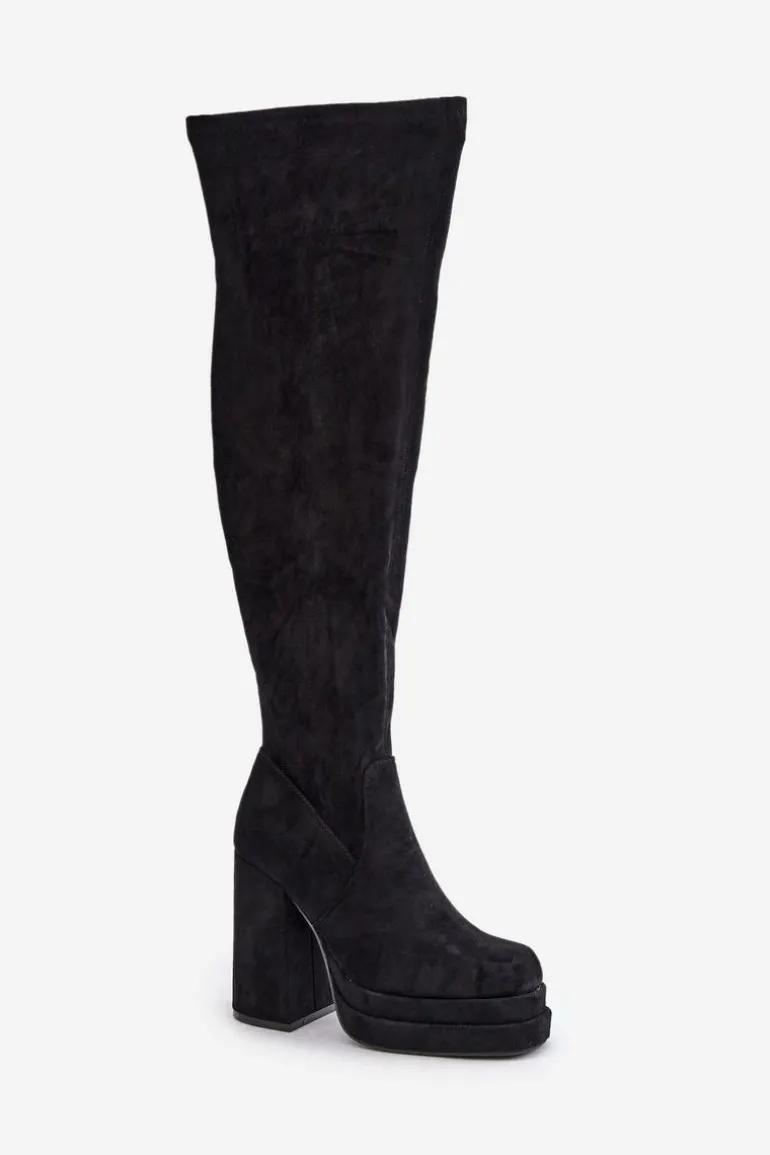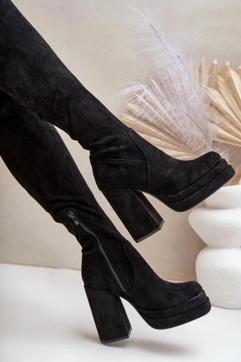 Kozaki z eko zamszu to świetna propozycja dla miłośniczek modnych, a zarazem wygodnych butów na chłodniejsze dni. Model wyróżnia się wysoką cholewką sięgającą za kolano, która dodaje elegancji i wydłuża sylwetkę. Kozaki są wsuwane, ale dla większej wygody posiadają dodatkowy suwak na dole cholewki, ułatwiający zakładanie. Osadzone na masywnym słupku oraz platformie, zapewniają stabilność i podkreślają nogi. Wnętrze ocieplone jest wyłącznie na wysokości stopy. Idealne do stylizacji z sukienkami czy spódnicami. Przy wyborze rozmiaru prosimy sugerować się tabelą rozmiarów.