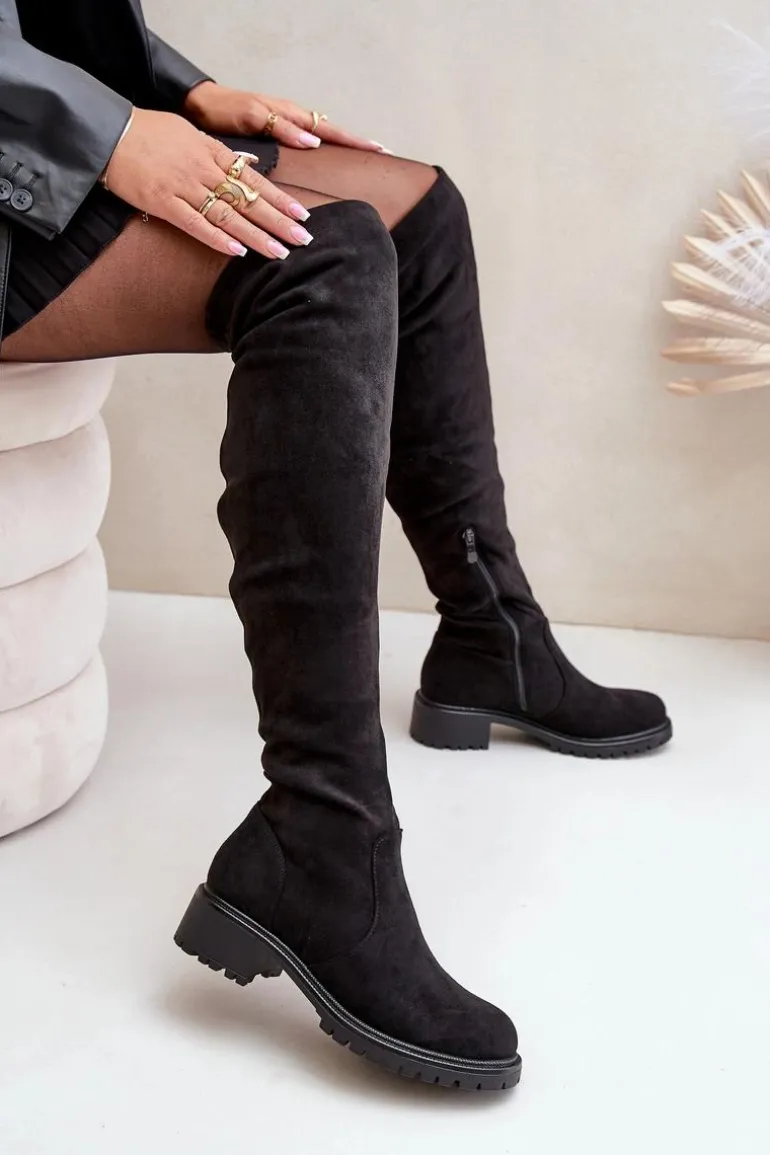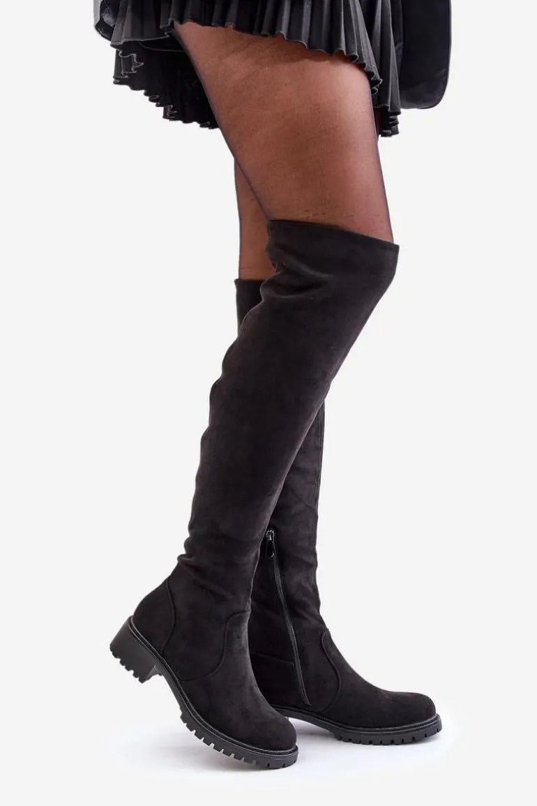 Damskie kozaki z cholewką sięgającą za kolano. Wykonane z ekologicznego zamszu. Osadzone na niskim obcasie. Model wsuwany z dodatkowym zapięciem na suwak. Noski są zaokrąglone. Wnętrze częściowo ocieplane kocem obuwniczym. Idealnie pasują do krótkich spódniczek lub sukienek. Kozaki te koniecznie powinny znaleźć się w Twojej zimowej kolekcji obuwia! Przy wyborze rozmiaru prosimy sugerować się tabelą rozmiarów.