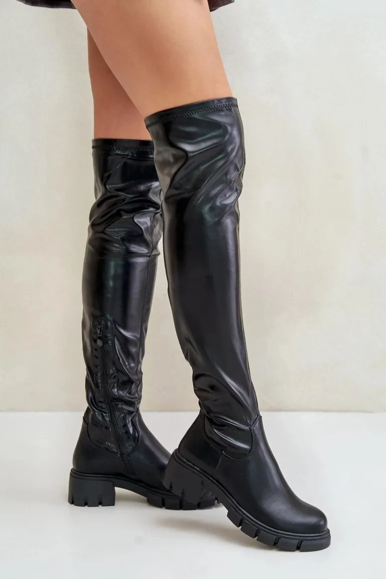 Kozaki wykonane z eko skóry to stylowy wybór na chłodniejsze dni. Osadzone na płaskim obcasie, gwarantują wygodę podczas codziennego noszenia. Model charakteryzuje się zaokrąglonymi noskami oraz cholewką sięgającą za kolano, dzięki czemu świetnie komponuje się z sukienkami i spódnicami, dodając elegancji każdej stylizacji. Wnętrze ocieplane jest wyłącznie na wysokości stopy, zapewniając komfort termiczny tam, gdzie jest najbardziej potrzebny. Idealne na co dzień, jak i na specjalne okazje, te kozaki łączą w sobie klasyczny design i praktyczność. Przy wyborze rozmiaru prosimy sugerować się tabelą rozmiarów.