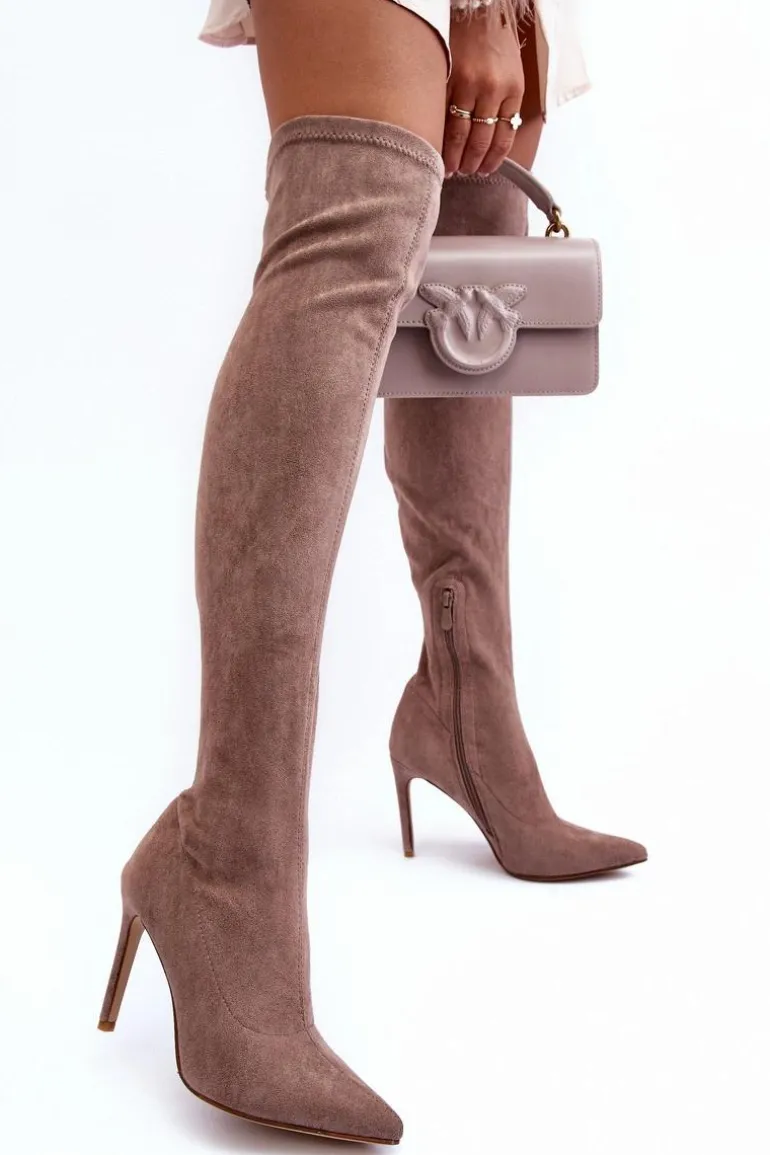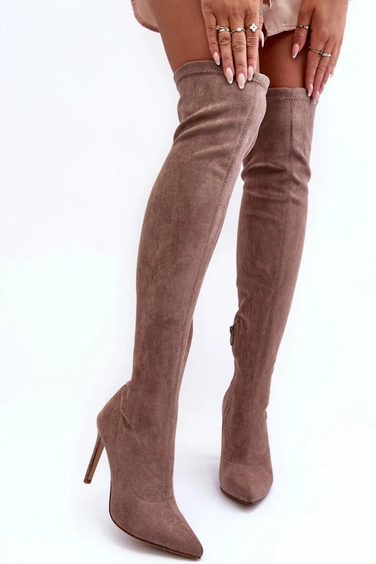 Modne kozaki za kolano zostały wykonane z eko zamszu. Zapinane na suwak w dolnej części cholewki. Obcas w postaci szpilki. Wnętrze ocieplone na wysokości stopy. Zapiętek usztywniony, noski w szpic. Koniecznie musisz mieć ten model w swojej garderobie! Przy wyborze rozmiaru prosimy kierować tabelą rozmiarów.