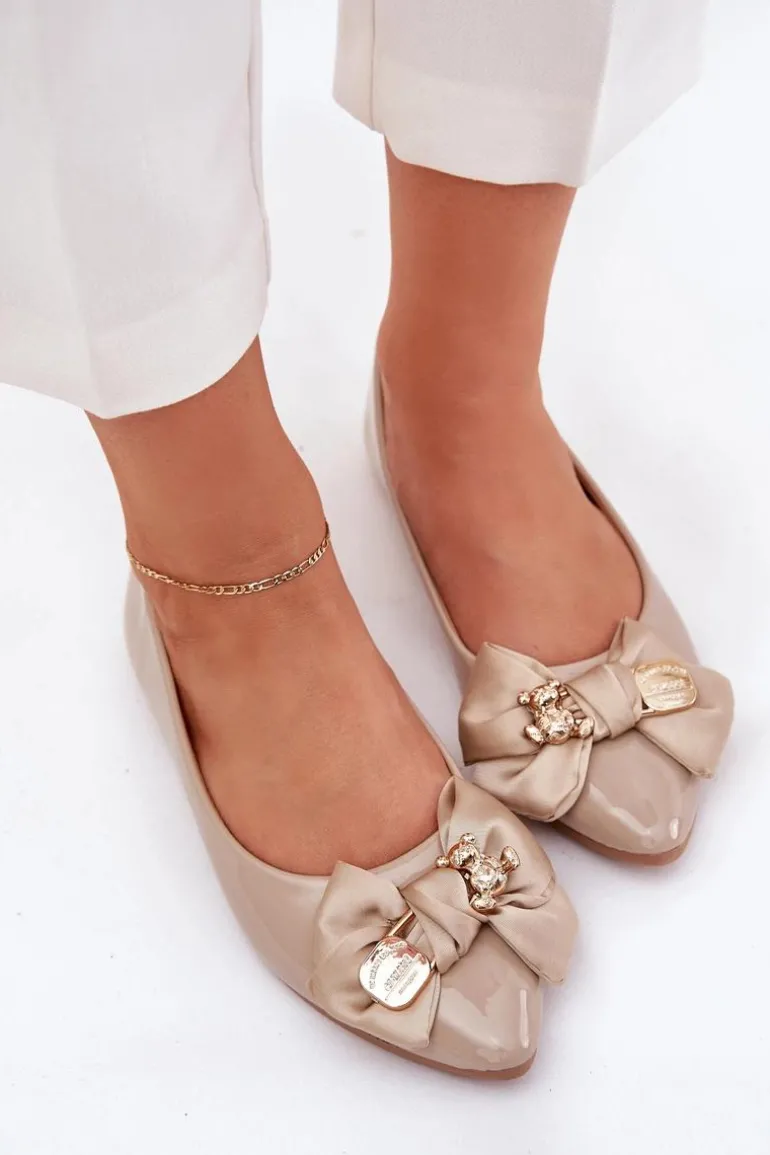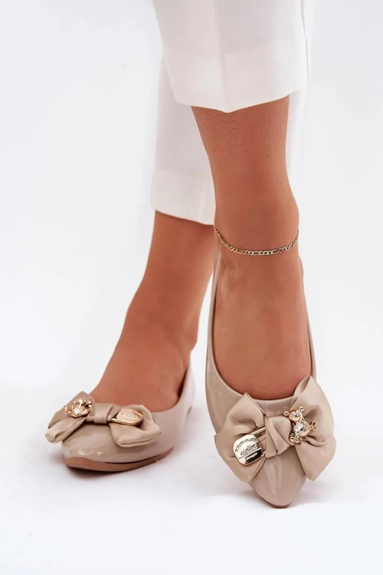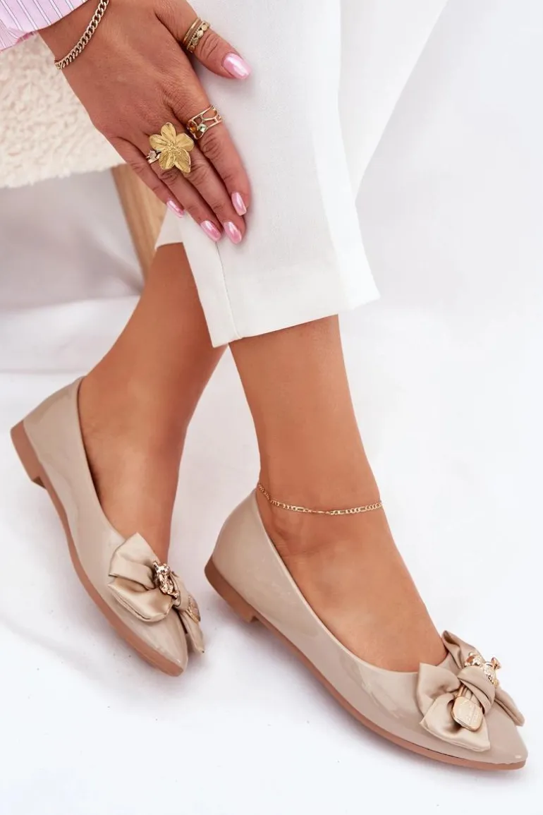 Baleriny damskie wykonane z eko skóry, łączące stylowy wygląd z komfortem. Model wyróżnia się migdałowymi noskami oraz uroczą kokardką ozdobioną złotą broszką, która dodaje im wyjątkowego uroku. Idealne do codziennych stylizacji, zapewniają wygodę i modny wygląd na każdą okazję. Przy wyborze rozmiaru prosimy sugerować się tabelą rozmiarów.