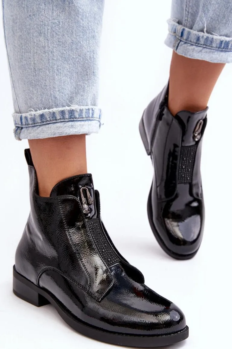 Botki damskie marki S.Barski wykonane z eko skóry. Osadzone na płaskim obcasie, który zapewni stabilność na każdym kroku. Środek ocieplony kocem obuwniczym. Noski zaokrąglone. Model zapinany na suwak. Cholewka za kostkę. Usztywniony zapiętek. Przy wyborze rozmiaru prosimy sugerować się tabelą rozmiarów.