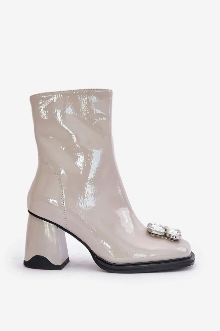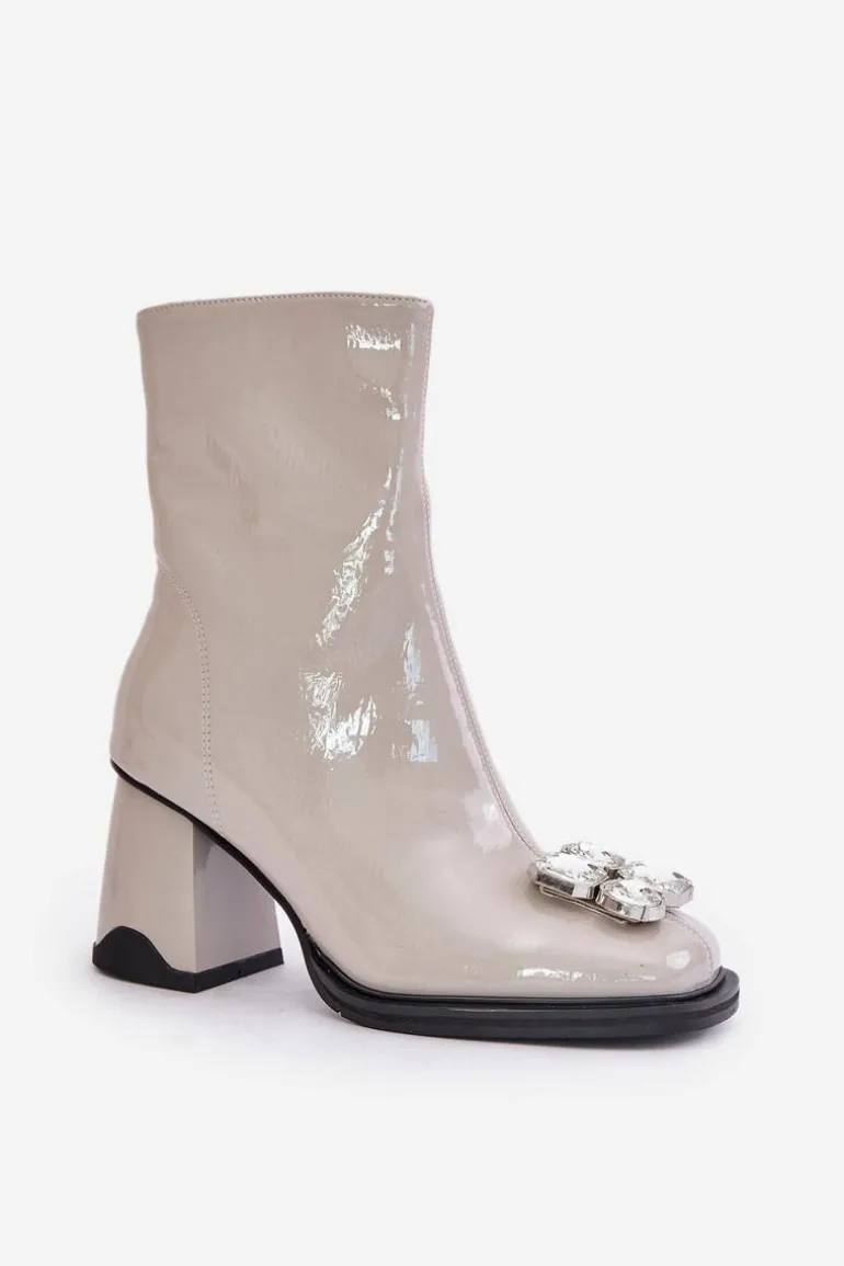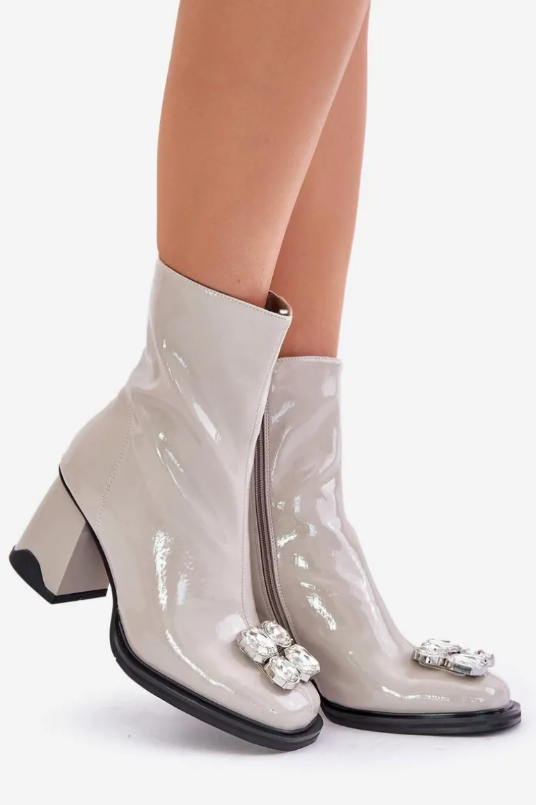 Lakierowane Botki Damskie Na Słupku Z Ozdobą D&A MR880-019 Jasnoszare