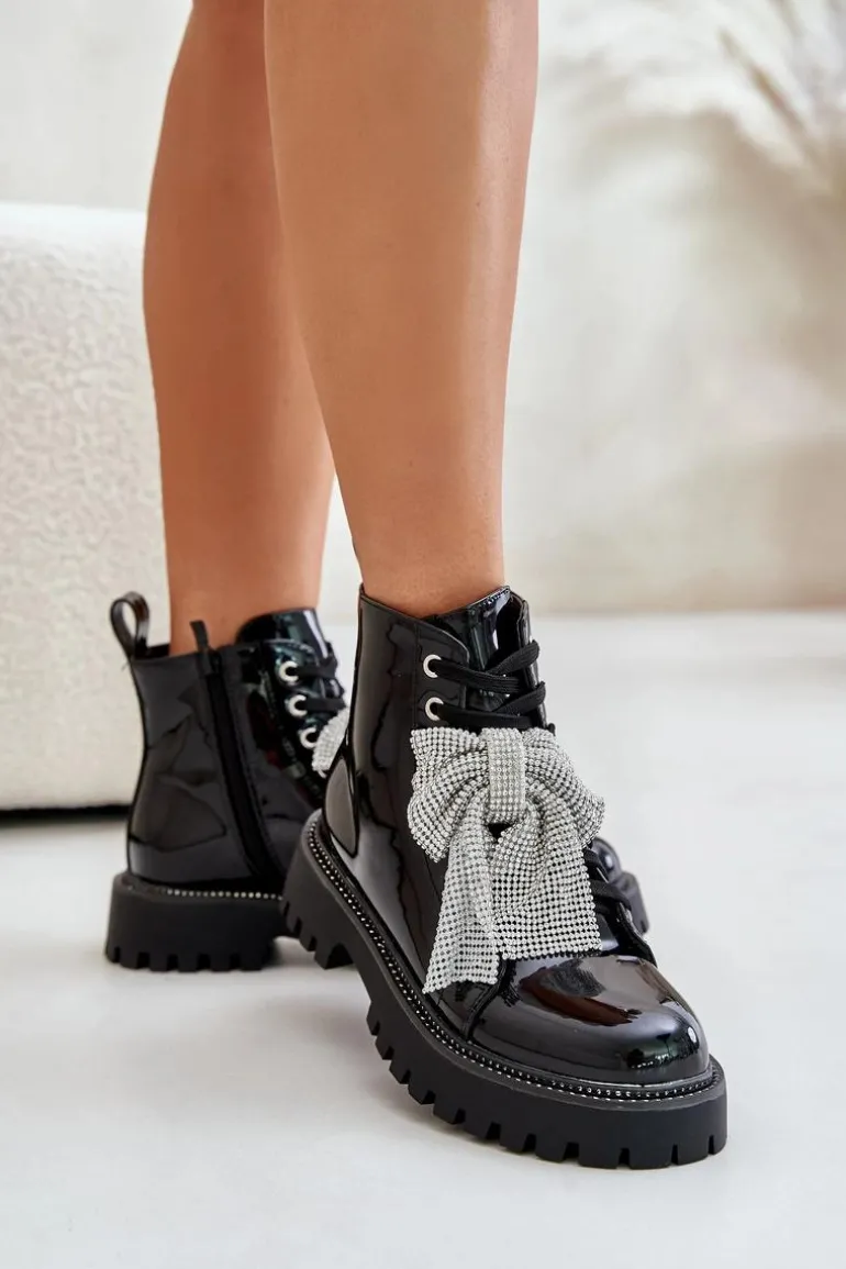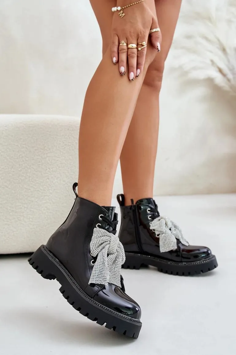 Botki na płaskim obcasie łączą w sobie wygodę i styl, idealnie wpisując się w codzienne i wyjątkowe stylizacje. Zaokrąglone noski nadają im klasyczny wygląd. Zapięcie na zamek ułatwia szybkie zakładanie, a dodatkowe sznurowanie pozwala na idealne dopasowanie do stopy. Główną zaletą tego modelu jest kokarda z cyrkoniami umieszczona z przodu, która dodaje eleganckiego i kobiecego akcentu, przyciągając wzrok i podkreślając wyjątkowość tego obuwia. Przy wyborze rozmiaru prosimy sugerować się tabelą rozmiarów.