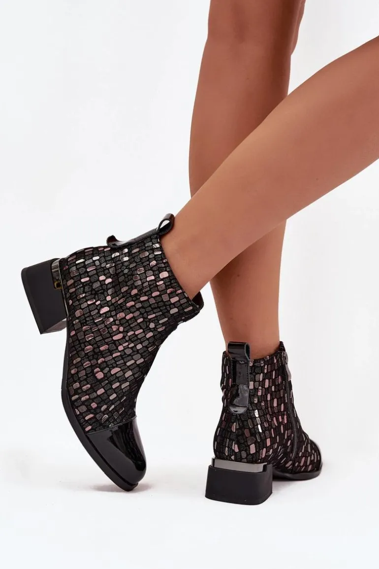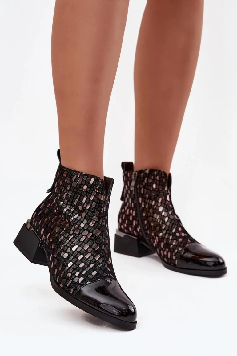 Eleganckie botki damskie wykonane z połączenia lakierowanej skóry naturalnej i zamszu to wyjątkowa propozycja dla kobiet, które cenią sobie oryginalny styl i wysoką jakość. Zestawienie dwóch rodzajów materiałów nadaje wyrazistego charakteru, a błyszczący wzór na cholewce przyciąga uwagę i podkreśla ich elegancję. Model został osadzony na stabilnym obcasie w formie klocka, który delikatnie unosi sylwetkę, zapewniając przy tym wygodę noszenia przez cały dzień. Wnętrze ocieplone kocem obuwniczym gwarantuje komfort termiczny w chłodniejsze dni, dzięki czemu botki świetnie sprawdzą się w sezonie jesienno-zimowym. To obuwie, które znakomicie dopełni zarówno codzienne stylizacje z jeansami, jak i bardziej wyrafinowane zestawy ze spódnicą czy sukienką, dodając im elegancji. Przy wyborze rozmiaru prosimy sugerować się tabelą rozmiarów.