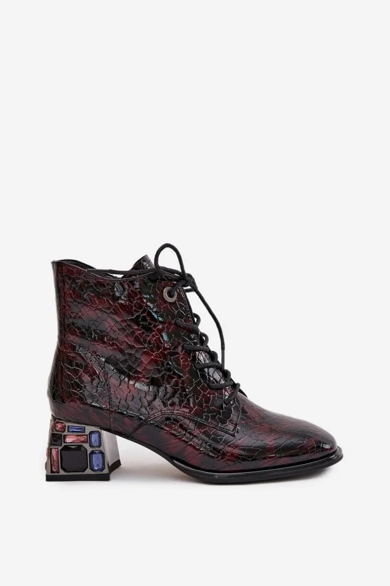 Botki damskie marki Artiker wykonane z lakierowanej skóry naturalnej to eleganckie obuwie z nutą oryginalności. Osadzone na stabilnym obcasie typu klocek, ozdobionym kryształkami, przyciągają uwagę i dodają stylizacjom wyjątkowego charakteru. Model łączy sznurowanie z praktycznym zamkiem, co ułatwia zakładanie i dopasowanie do stopy. Zaokrąglone noski podkreślają klasyczny fason, a wnętrze ocieplone miękkim w dotyku kocem obuwniczym zapewnia komfort i ciepło w chłodniejsze dni. Przy wyborze rozmiaru prosimy sugerować się tabelą rozmiarów.