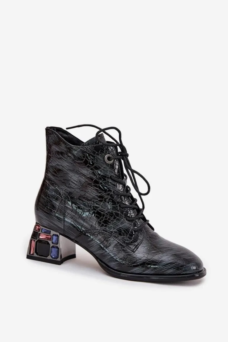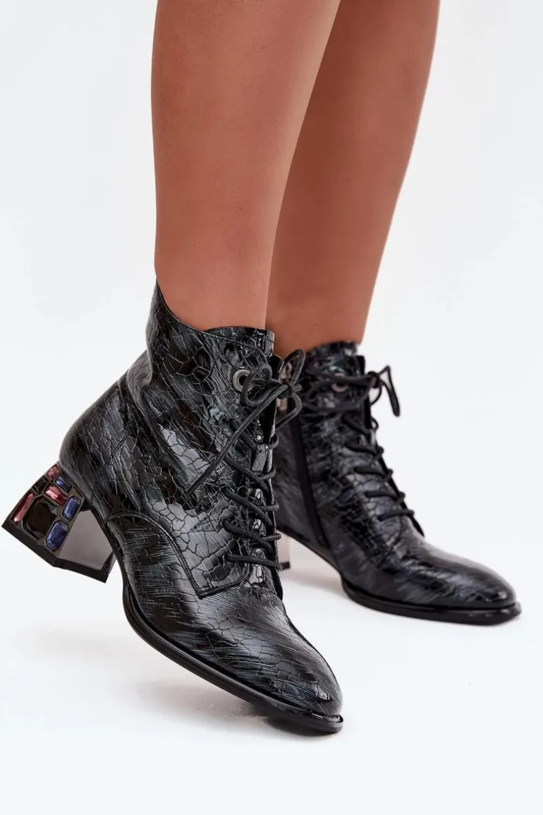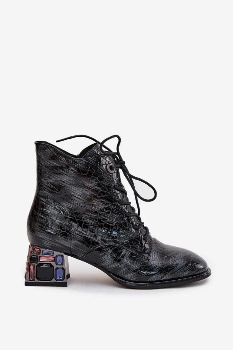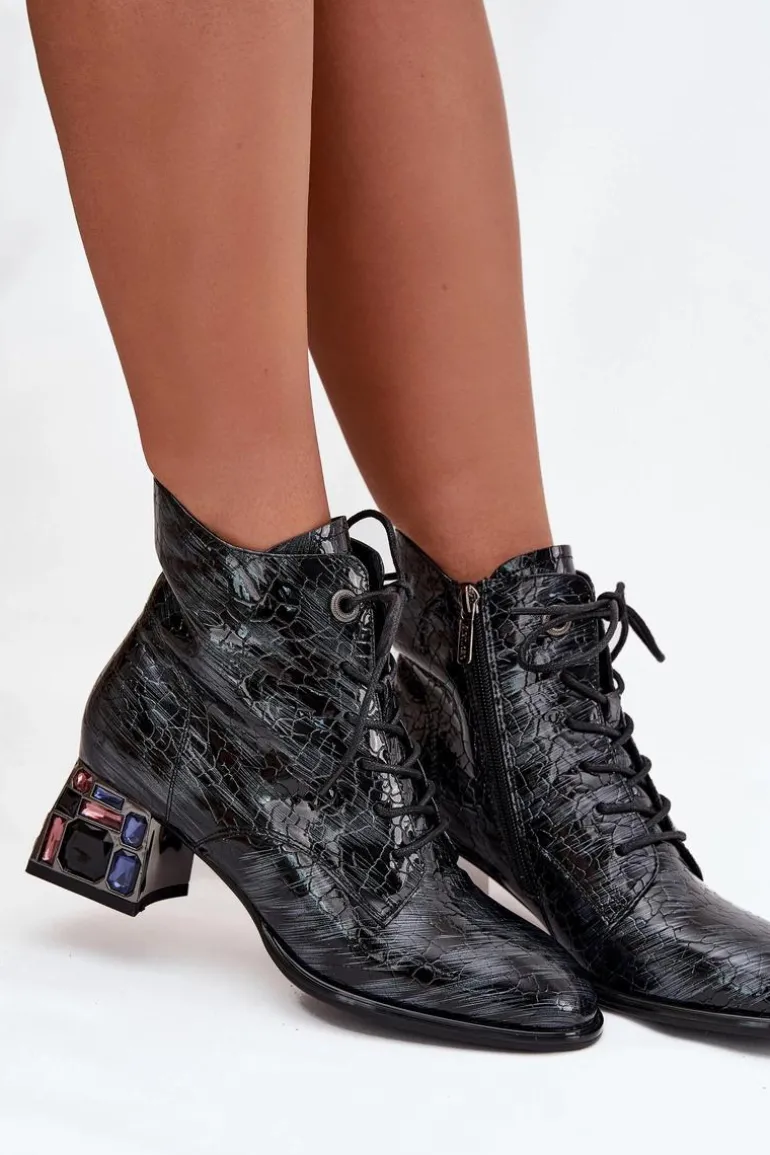 Botki damskie marki Artiker wykonane z lakierowanej skóry naturalnej to eleganckie obuwie z nutą oryginalności. Osadzone na stabilnym obcasie typu klocek, ozdobionym kryształkami, przyciągają uwagę i dodają stylizacjom wyjątkowego charakteru. Model łączy sznurowanie z praktycznym zamkiem, co ułatwia zakładanie i dopasowanie do stopy. Zaokrąglone noski podkreślają klasyczny fason, a wnętrze ocieplone miękkim w dotyku kocem obuwniczym zapewnia komfort i ciepło w chłodniejsze dni. Przy wyborze rozmiaru prosimy sugerować się tabelą rozmiarów.