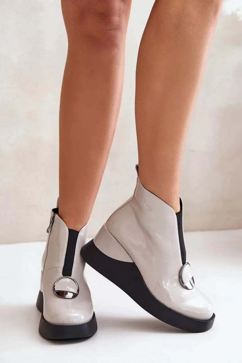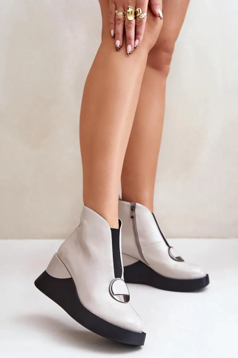 Eleganckie botki damskie osadzone na koturnie i platformie. Wykonane z eko skóry. Zapinane na suwak z boku. Z Przodu elastyczna wstawka oraz ozdoba. Noski zaokrąglone. Środek ocieplony kocem obuwniczym. Model ten z pewnością dopełni wiele jesienno-zimowych stylizacji! Przy wyborze rozmiaru prosimy sugerować się tabelą rozmiarów.