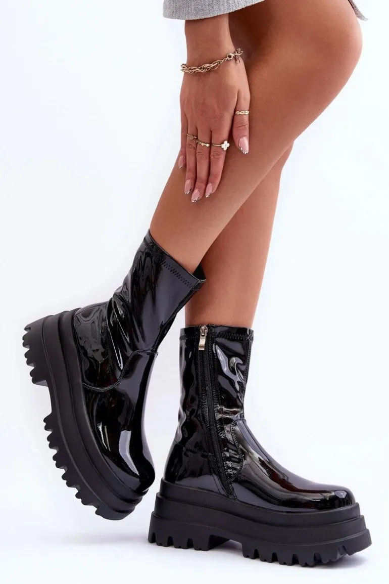 Botki damskie z lakierowanej eko skóry to doskonała propozycja na chłodniejsze dni. Osadzone na masywnej platformie, zapewniają stabilność i dodatkową wysokość. Zapinane na zamek, ułatwiają zakładanie, a zaokrąglone noski dodają im subtelnego charakteru. Wnętrze ocieplone kocem obuwniczym tylko na wysokości stopy gwarantuje ciepło, a jednocześnie pozwala na swobodę ruchu. Koniecznie powinnaś je mieć w swojej jesienno-zimowej szafie! Przy wyborze rozmiaru prosimy sugerować się tabelą rozmiarów.