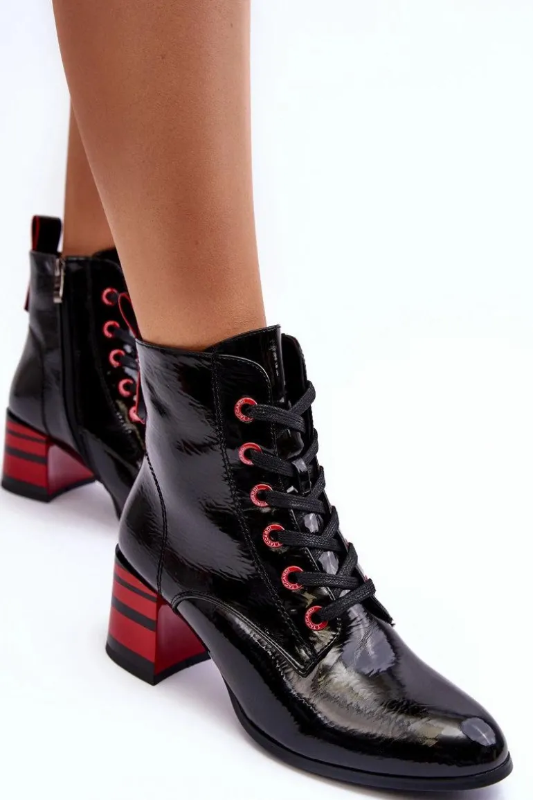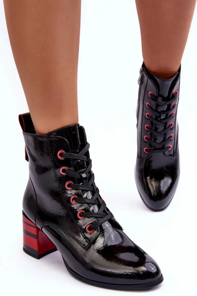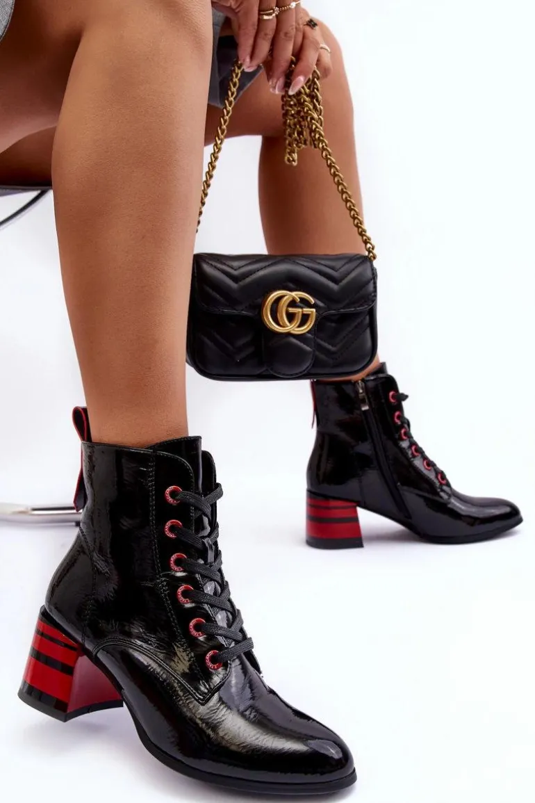 Botki damskie wykonane z eko skóry. Zapinane na suwak z boku cholewki oraz dodatkowo posiadają sznurowanie. Obcas ozdobiony paskami. Noski w migdał. Miękka wkładka zapewni komfort podczas użytkowania. Środek ocieplony kocem obuwniczym. Dodatkowo zapiętek jest usztywniony. Przy wyborze rozmiaru prosimy sugerować się tabelą rozmiarów.
