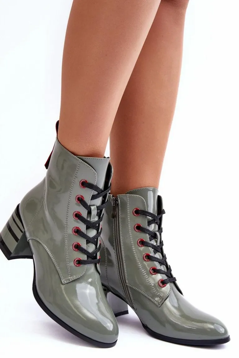 Botki damskie wykonane z eko skóry. Zapinane na suwak z boku cholewki oraz dodatkowo posiadają sznurowanie. Obcas ozdobiony paskami. Noski w migdał. Miękka wkładka zapewni komfort podczas użytkowania. Środek ocieplony kocem obuwniczym. Dodatkowo zapiętek jest usztywniony. Przy wyborze rozmiaru prosimy sugerować się tabelą rozmiarów.