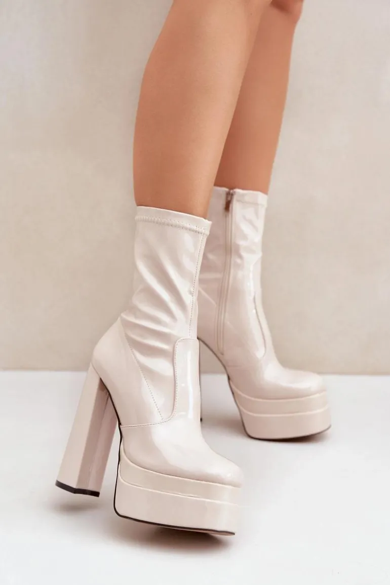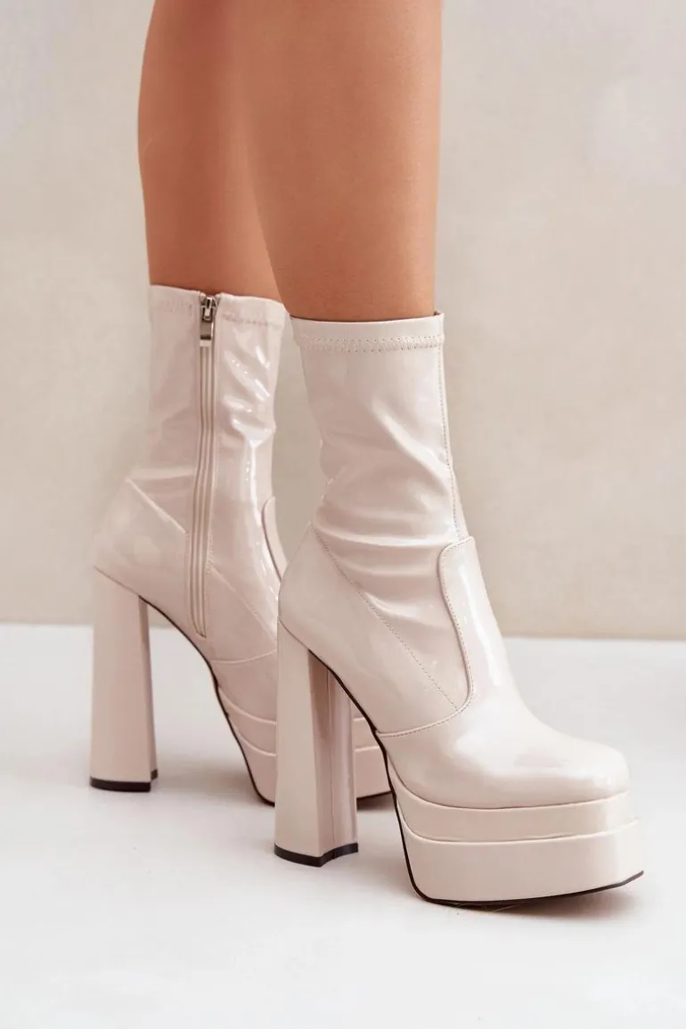 Stylowe botki damskie lakierowane, osadzone na wysokim obcasie typu słupek oraz platformie, które zapewniają wygodę i stabilność. Model z zaokrąglonymi noskami, zapinany na zamek dla łatwego zakładania. Ocieplane na wysokości stopy, doskonałe na chłodniejsze dni. Model ten świetnie uzupełni różnorodne stylizacje. Przy wyborze rozmiaru prosimy sugerować się tabelą rozmiarów.