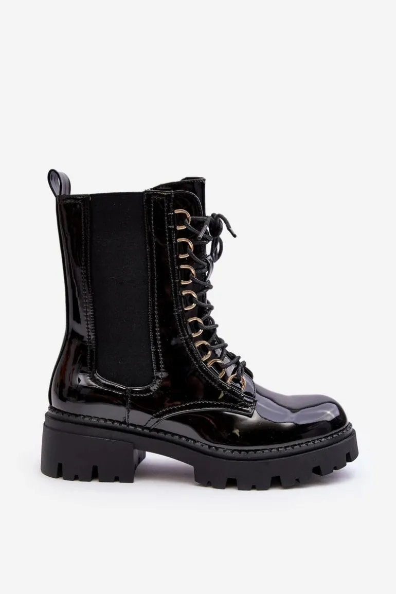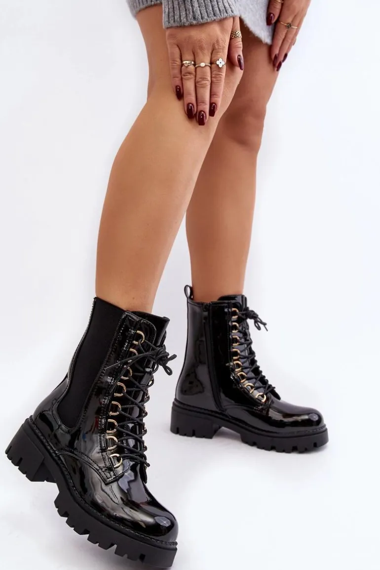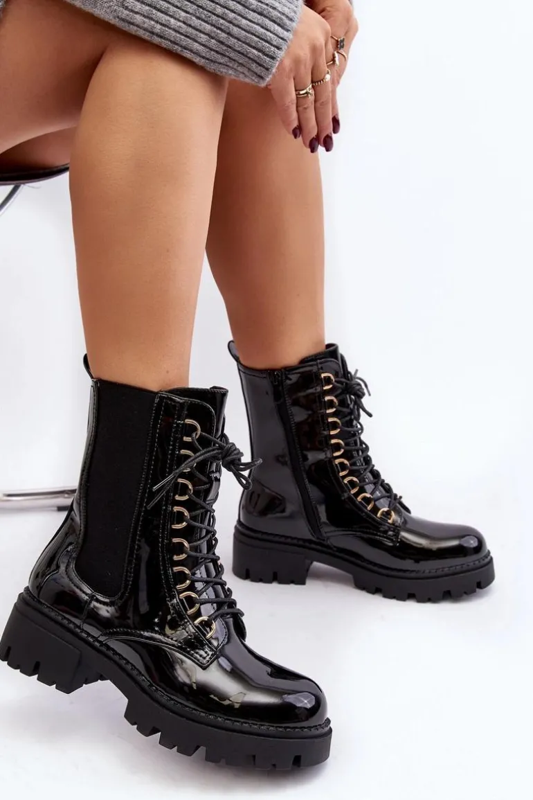 Damskie botki wykonane z eko skóry. Osadzone na płaskim obcasie. Na cholewce elastyczne wstawki. Noski zaokrąglone. Model ten zapinany jest na suwak z boku oraz dodatkowo posiada sznurowanie. Wnętrze ocieplone kocem obuwniczym. Świetny model do jesiennych i zimowych stylizacji! Przy wyborze rozmiaru prosimy sugerować się tabelą rozmiarów.