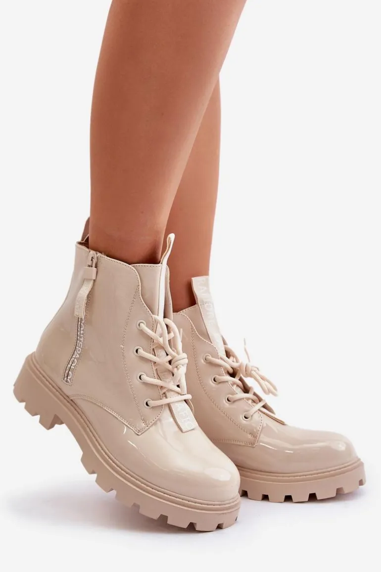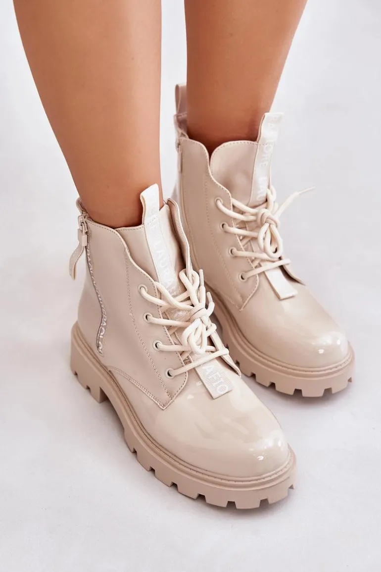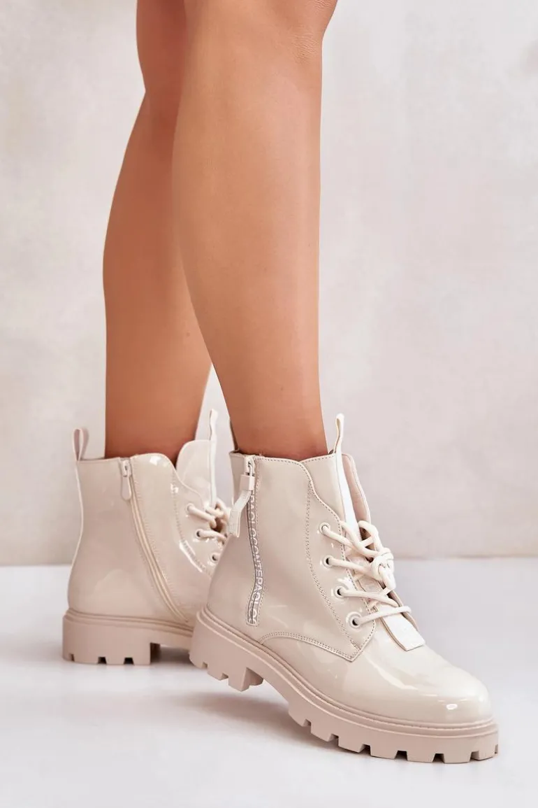 Lakierowane Botki Workery Damskie Ocieplane Z Napisami Beżowe Zinfreya