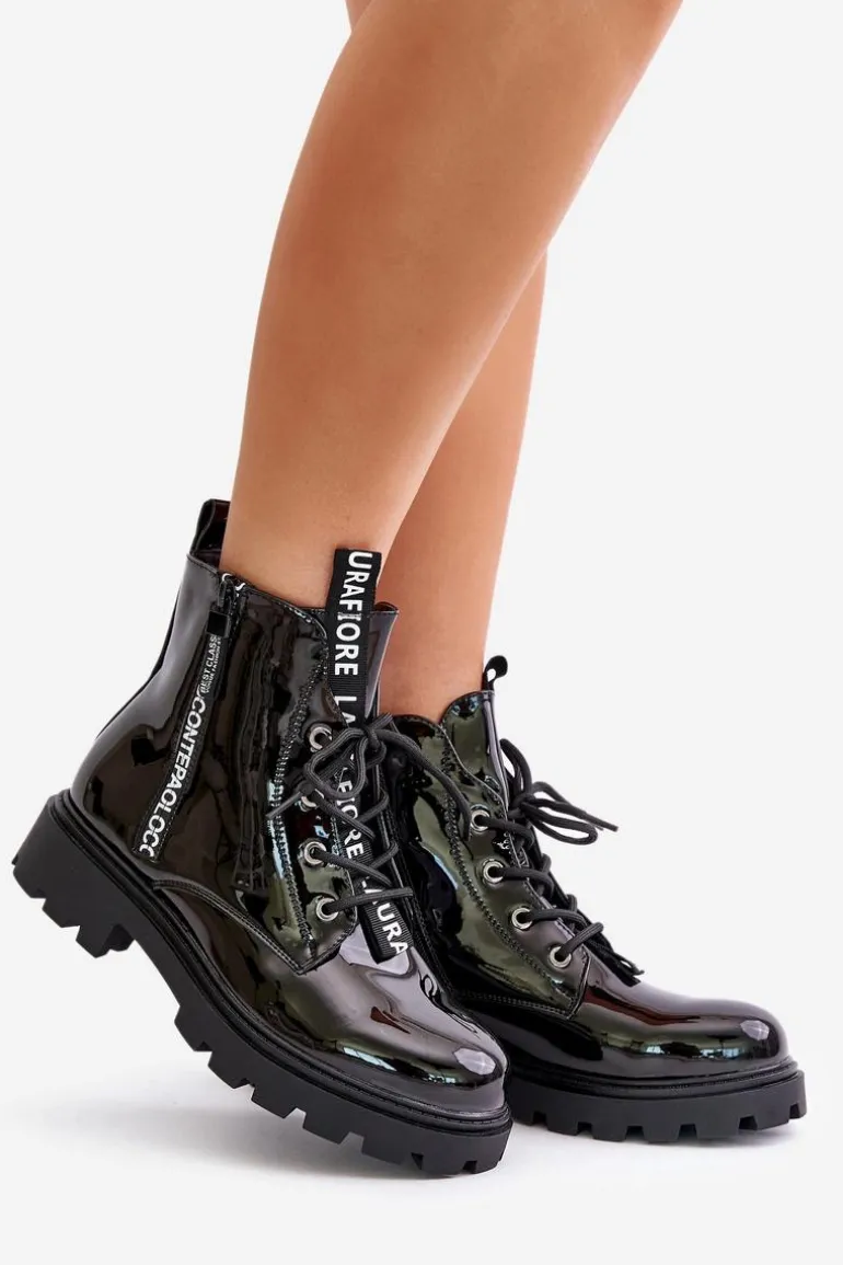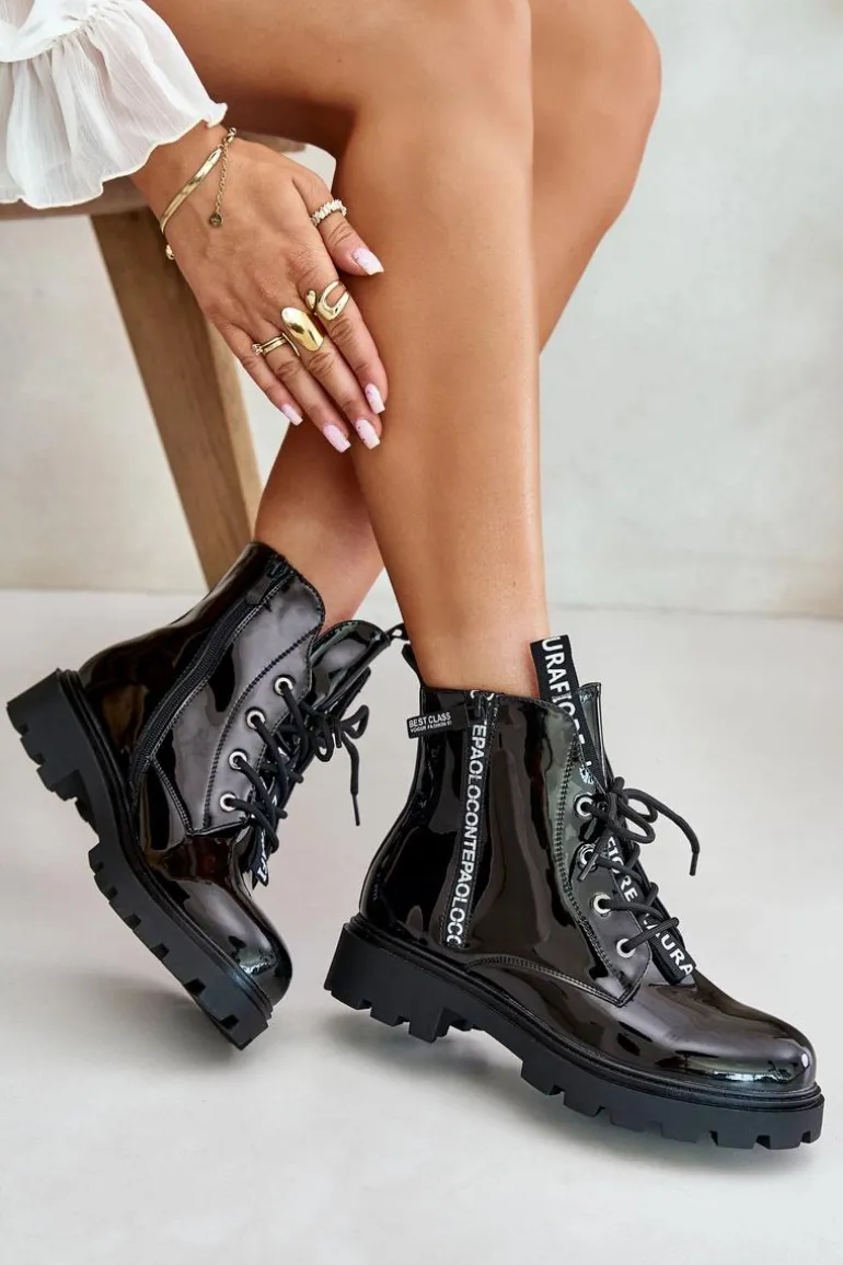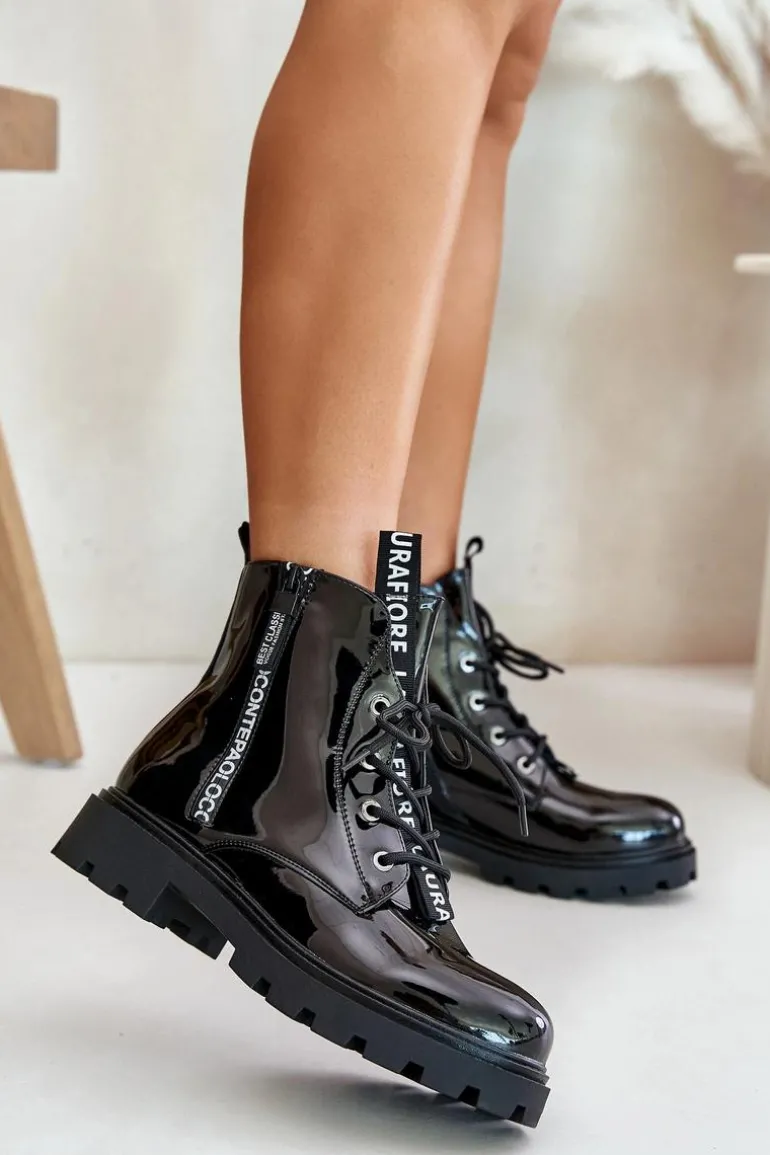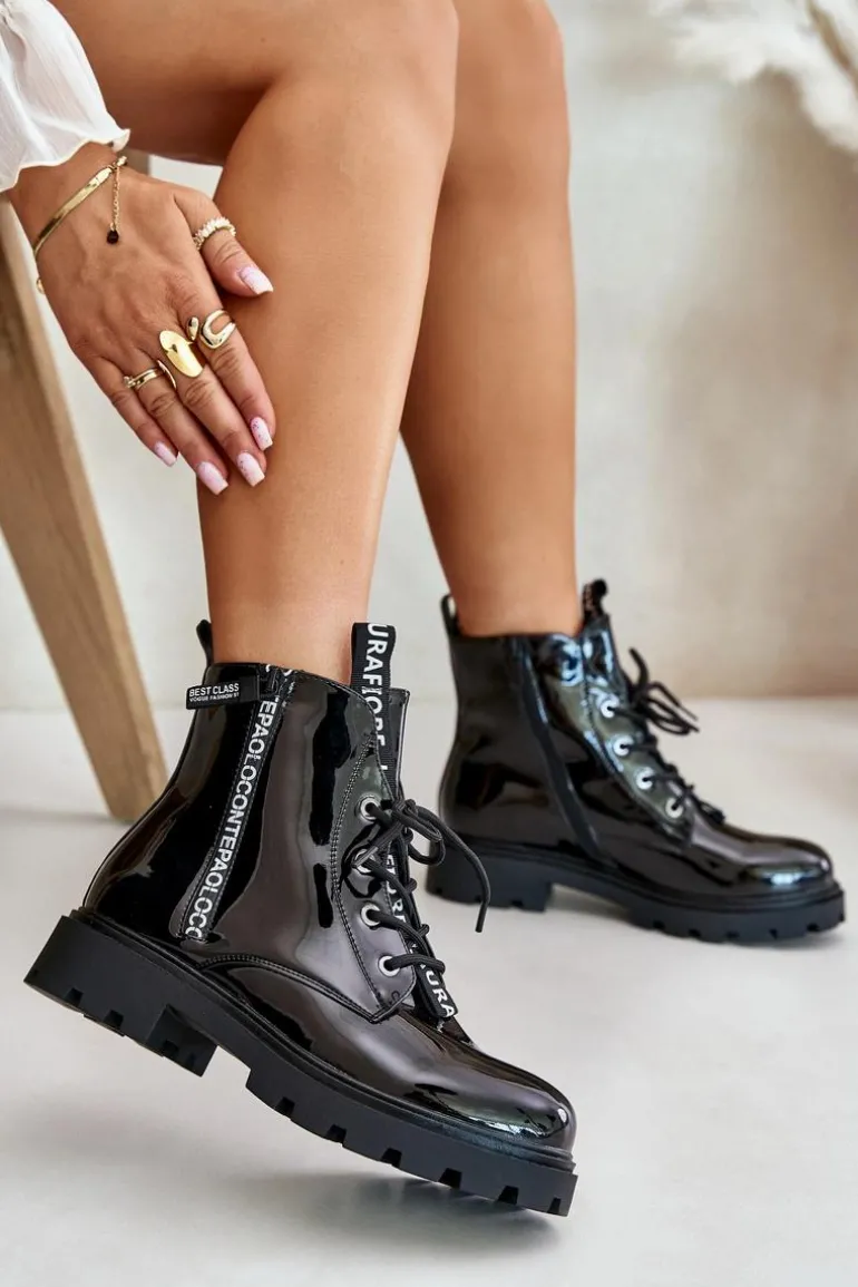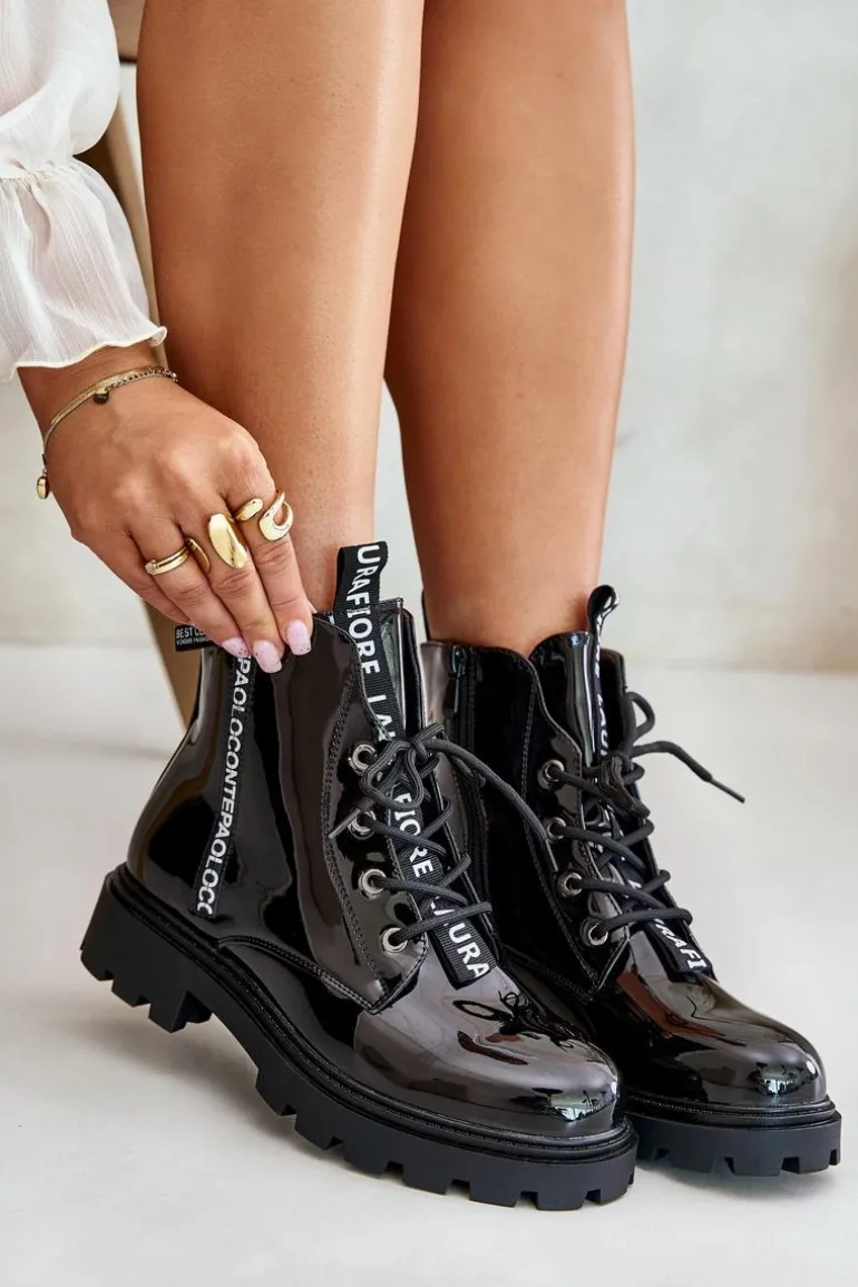 Stylowe botki damskie z ociepleniem, idealne na chłodne dni. Model zapinany na zamek oraz dodatkowo sznurowany, co zapewnia idealne dopasowanie. Cholewka ozdobiona modnymi napisami, dodającymi oryginalnego charakteru. Świetny wybór dla kobiet ceniących wygodę i modny wygląd. Przy wyborze rozmiaru prosimy sugerować się tabelą rozmiarów.