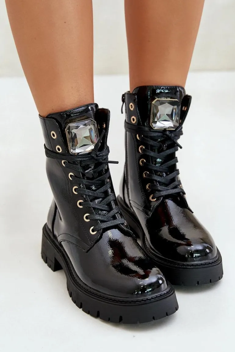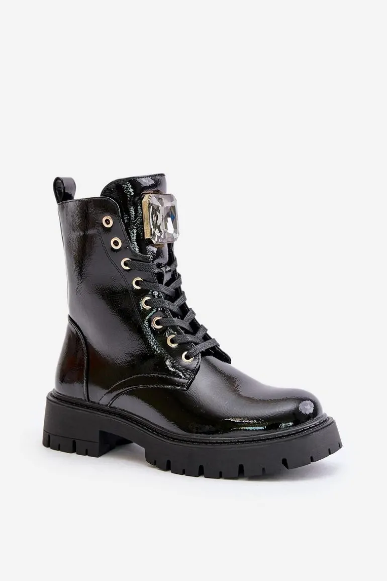 Te stylowe botki typu workery to idealne obuwie na chłodniejsze dni. Wykonane z eko skóry. Ocieplone wnętrze zapewnia komfort termiczny. Głównym atutem tego modelu jest biżuteryjna ozdoba na języku. Posiadają zamek błyskawiczny dla łatwego zakładania, jak i sznurowanie, które pozwala na idealne dopasowanie do stopy. Botki te doskonale sprawdzą się idealnie w codziennych stylizacjach, jak i podczas dłuższych spacerów na świeżym powietrzu. Przy wyborze rozmiaru prosimy sugerować się tabelą rozmiarów.