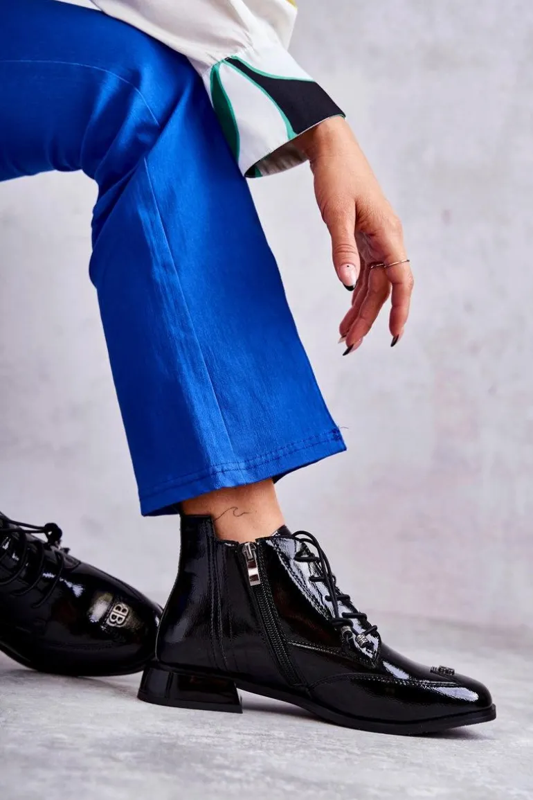 Te botki świetnie sprawdzą się podczas jesiennego sezonu! Wykonane z wysokiej jakości eko skóry z elastyczną wstawką z boku cholewki, dzięki której obuwie będzie lepiej dopasowane. Zapinane na suwak. Z przodu posiadają ściągacz, a przy nosku ozdobny element. Osadzone na płaskim obcasie. Dodatkowo zapiętek jest usztywniany. Środek został ocieplony miłym, w dotyku kocem obuwniczym. Przy wyborze rozmiaru prosimy sugerować się tabelą rozmiarów.