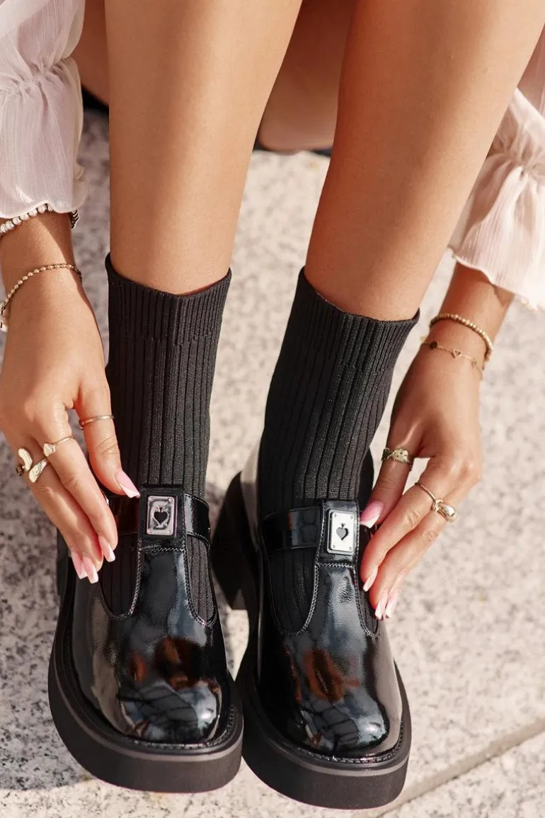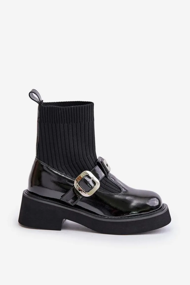 Lakierowane botki damskie osadzone na niskim, szerokim obcasie i platformie. Cholewka w formie skarpety, dodatkowo zdobiona stylowym paskiem z klamrą, nadaje im nowoczesny charakter. Środek ocieplony kocem obuwniczym wyłącznie na wysokości stopy. Idealne do miejskich stylizacji, łączą wygodę z modnym wyglądem. Przy wyborze rozmiaru prosimy sugerować się tabelą rozmiarów.