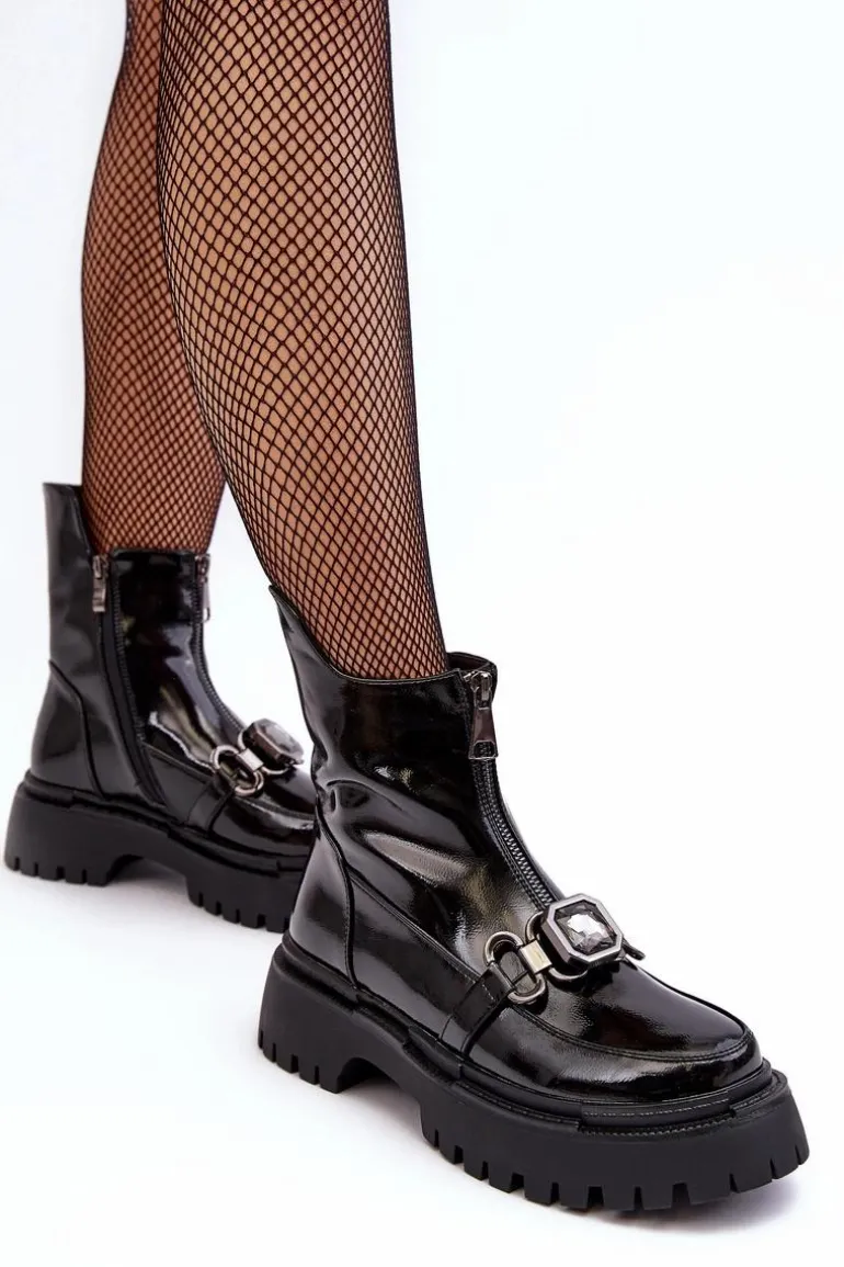 Piękne, damskie botki zostały wykonane z wysokiej jakości eko skóry. Osadzono je na płaskim obcasie. Przód obuwia został wzbogacony modnym kryształem. Wnętrze obuwia ocieplono miękkim kocem obuwniczym. Model ten jest zapinany na suwak z boku oraz dodatkowo posiada na przodzie imitację zamka. Zapiętek w tych butach został usztywniony. Przy wyborze rozmiaru prosimy sugerować się tabelą rozmiarów.