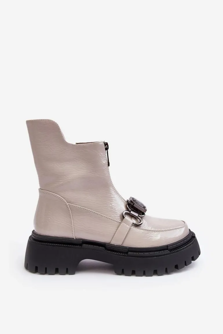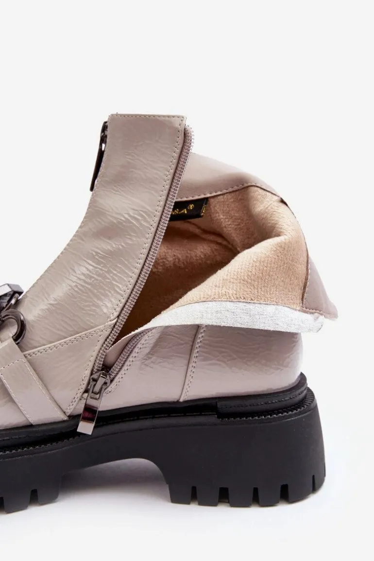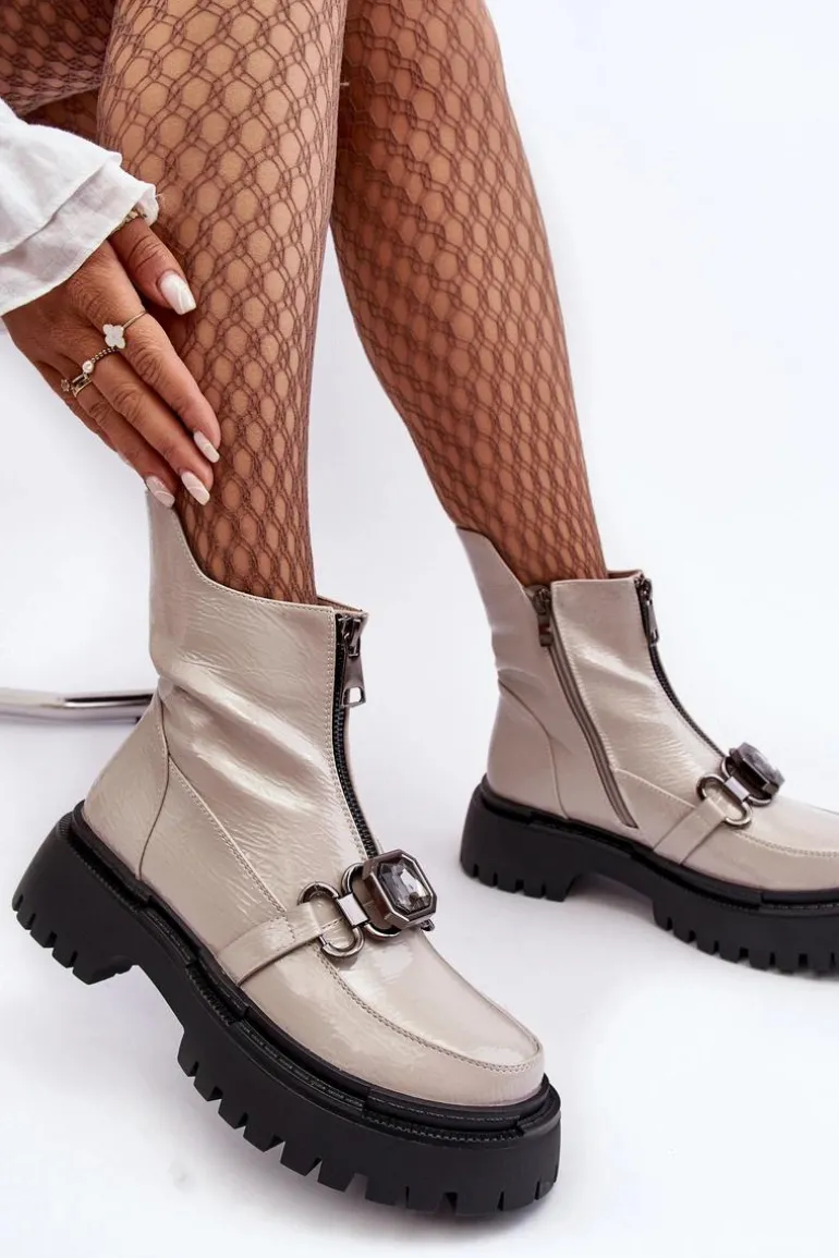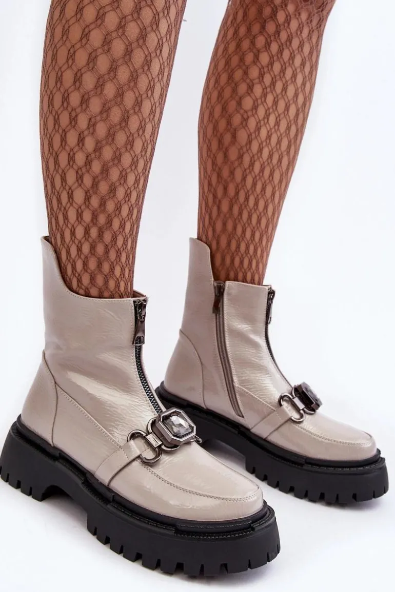 Piękne, damskie botki zostały wykonane z wysokiej jakości eko skóry. Osadzono je na płaskim obcasie. Przód obuwia został wzbogacony modnym kryształem. Wnętrze obuwia ocieplono miękkim kocem obuwniczym. Model ten jest zapinany na suwak z boku oraz dodatkowo posiada na przodzie imitację zamka. Zapiętek w tych butach został usztywniony. Przy wyborze rozmiaru prosimy sugerować się tabelą rozmiarów.