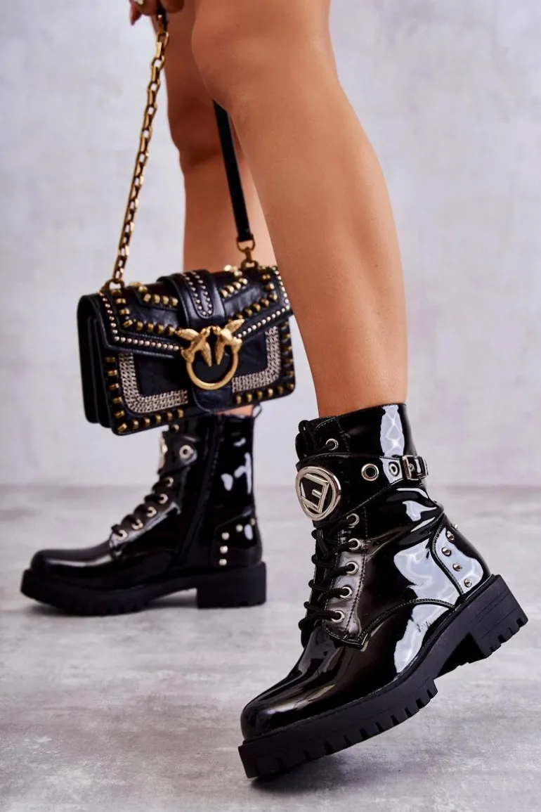 Modne damskie botki świetnie sprawdzą się podczas jesiennych stylizacji! Wykonane z eko skóry. Dodatkowo zostały przyozdobione ćwiekami oraz emblematem z tworzywa sztucznego. Botki posiadają klasyczne wiązanie oraz suwak. W środku znajduje się ocieplenie w postaci koca obuwniczego. Osadzone na płaskim obcasie oraz platformie. Przy wyborze rozmiaru prosimy sugerować się tabelą rozmiarów.
