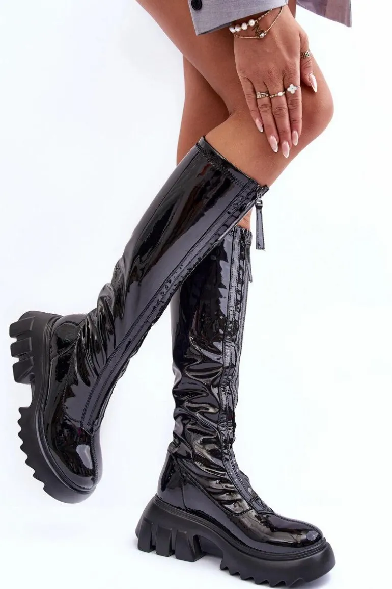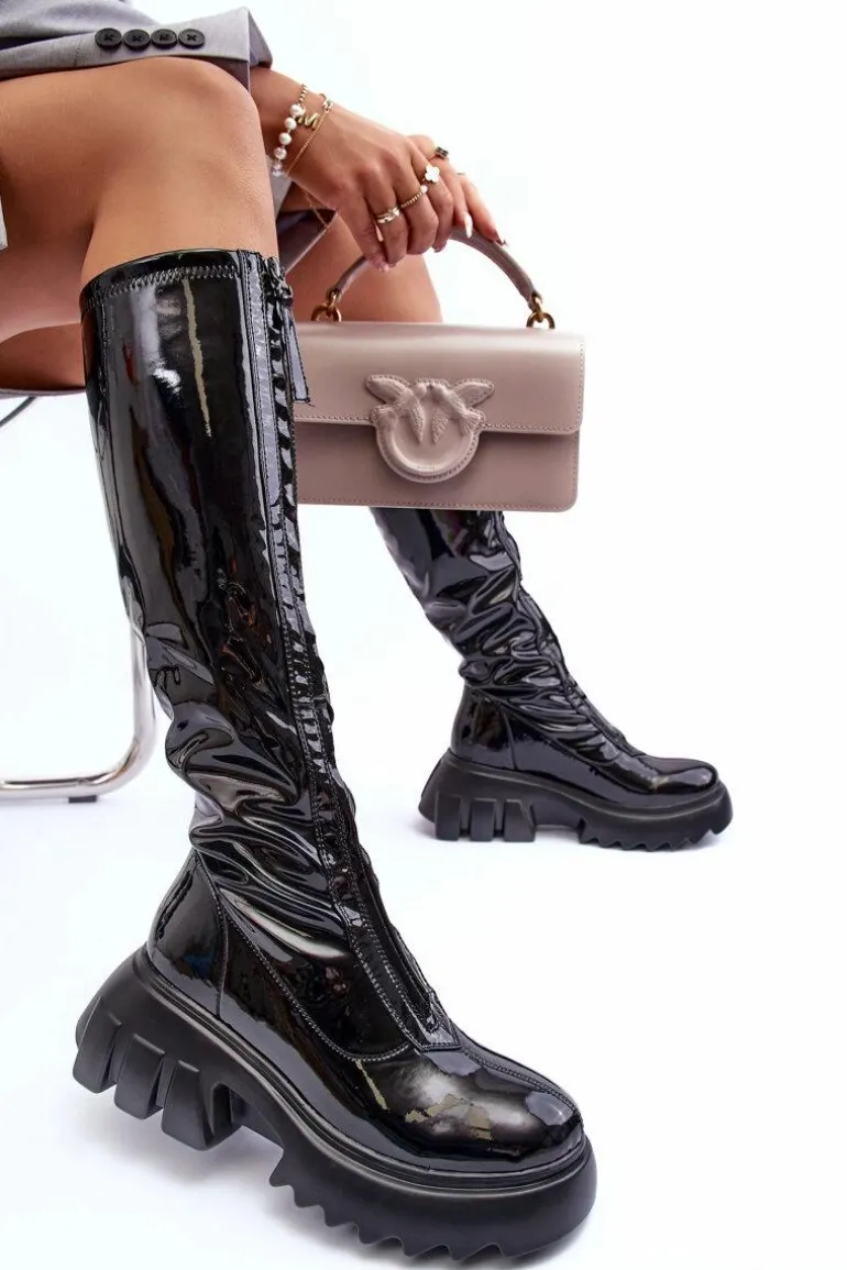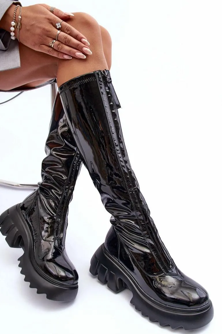 Modne, damskie kozaki do kolana. Wykonane z eko skóry. Osadzone na masywnej platformie i płaskim obcasie. Model zapinany na suwak, który znajduje się na całej długości cholewki z przodu. Zapiętek jest usztywniany, noski zaokrąglone. Środek ocieplony kocem obuwniczym. Przy wyborze rozmiaru prosimy kierować tabelą rozmiarów.