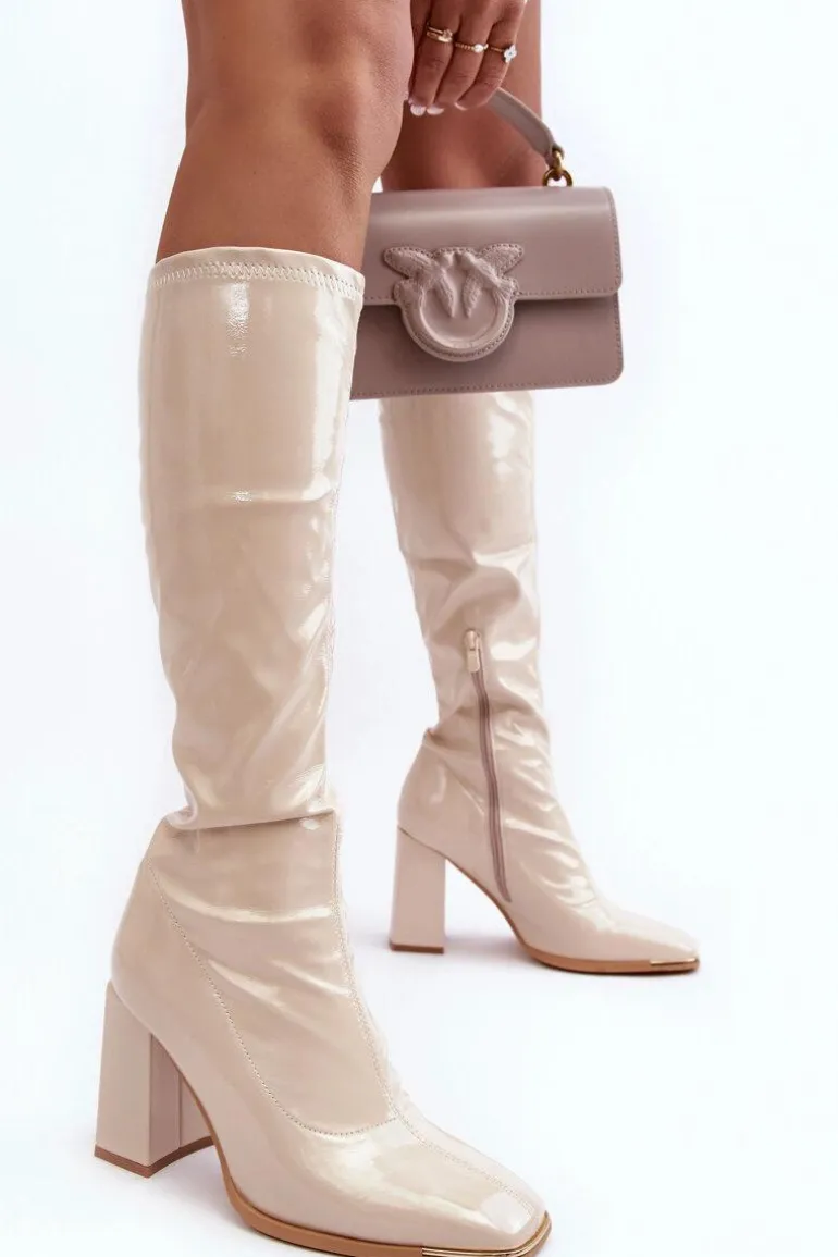 Kozaki damskie z cholewką przed kolano. Wykonane z eko skóry. Osadzone na obcasie w postaci słupka. Noski w kwadrat. Nieocieplane. Model wsuwany z dodatkowym suwakiem na dole cholewki. Idealny model zarówno do sukienek, jak i spodni! Przy wyborze rozmiaru prosimy sugerować się tabelą rozmiarów.