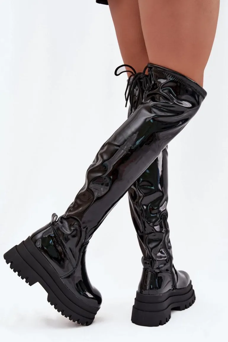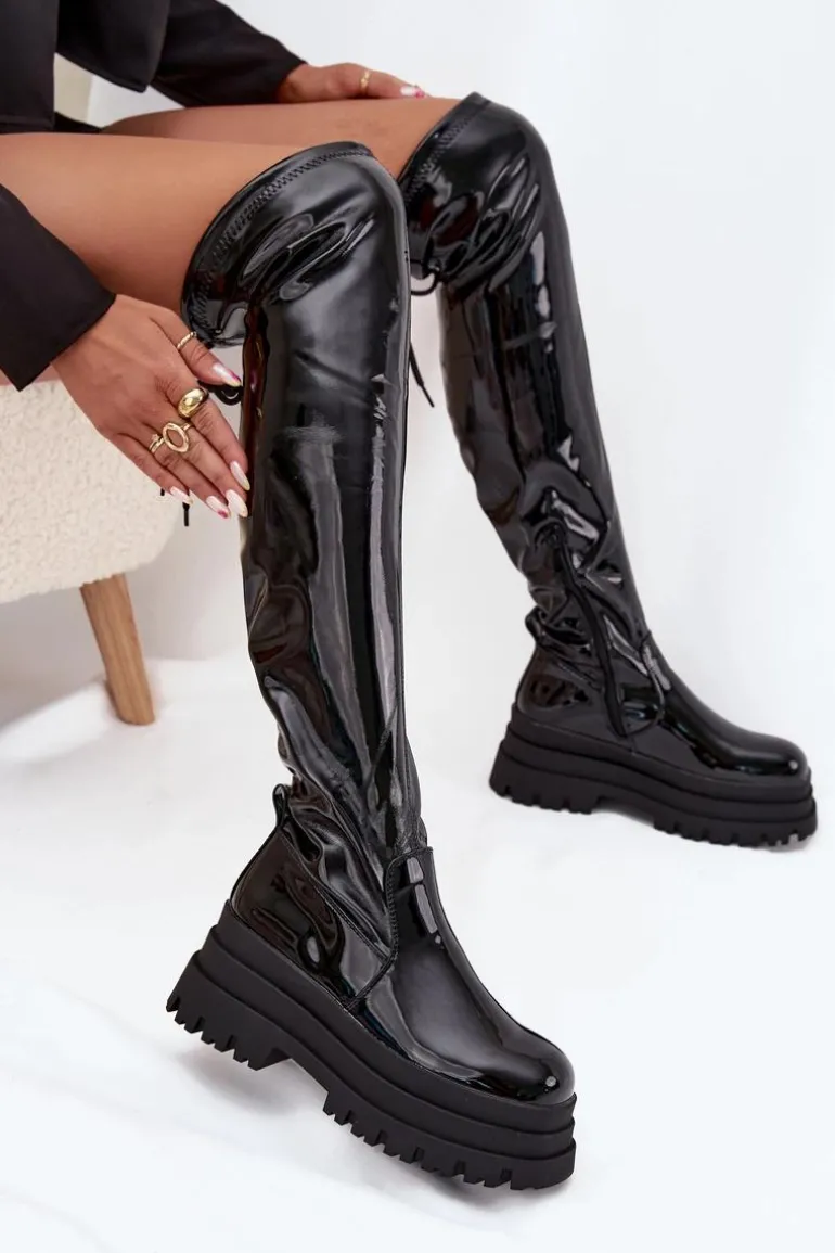 Kozaki damskie wykonane z lakierowanej eko skóry. Osadzone na masywnej platformie, zapewniają stabilność i wygodę. Zaokrąglone noski dodają subtelności, a model wsuwany z dodatkowym suwakiem na dole cholewki ułatwia zakładanie. Ściągacz na górze cholewki dodaje im charakteru, a ocieplenie kocem obuwniczym wyłącznie na poziomie stopy gwarantuje ciepło i komfort. Idealne na chłodniejsze dni, te kozaki doskonale sprawdzą się w zimowych stylizacjach z sukienkami i spódnicami. Przy wyborze rozmiaru prosimy sugerować się tabelą rozmiarów.